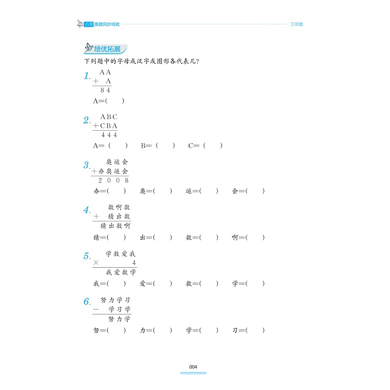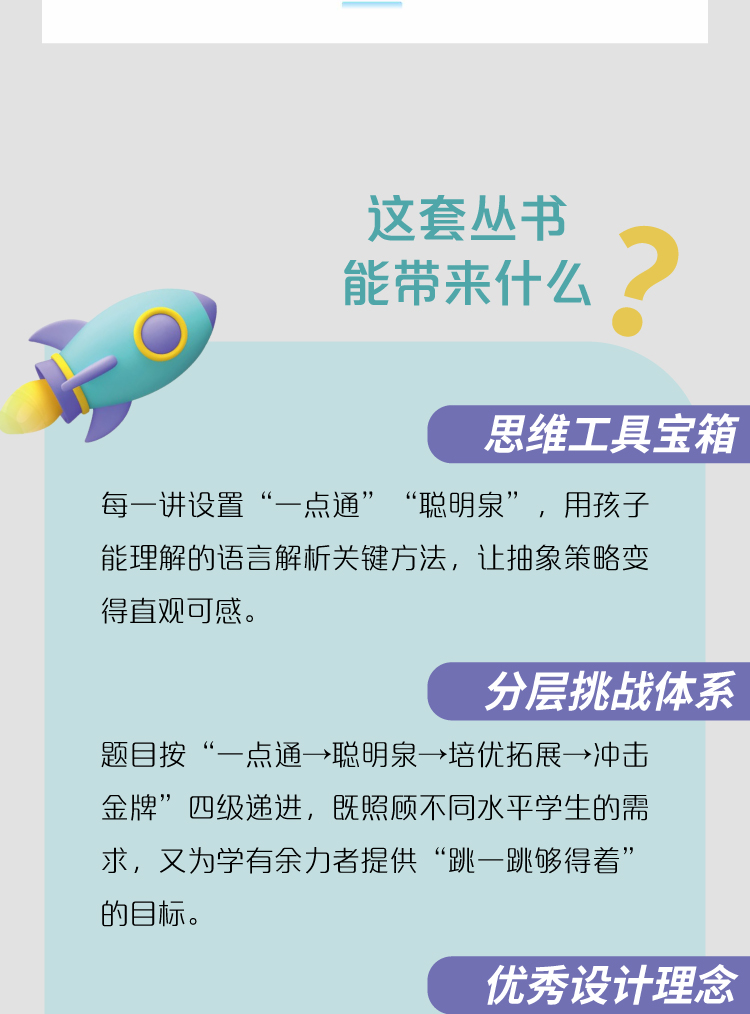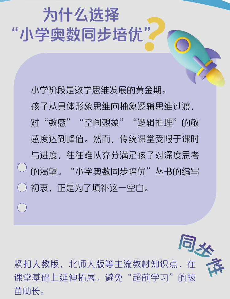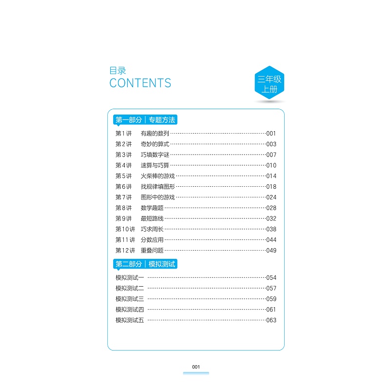 本书内容渗透了各地数学竞赛题的解题方法,突出培养学生的思维能力和逻辑推理能力,从而培养学生学习数学的兴趣。本书的特色有:1.不超出课程标准的要求,注重在教材、课堂学习的基础上适当补充和加深,启发学生灵活运用知识。2.不超前学习,进度与平时教材学习基本保持一致,并且尽可能与课堂教学配合。3.力求讲透内容,练习题量少而精,着重训练思维方法和能力,旨在让学生真正学到一点有用的思路、方法和技巧。4.趣味性强,很多题目能丰富学生的课外知识。