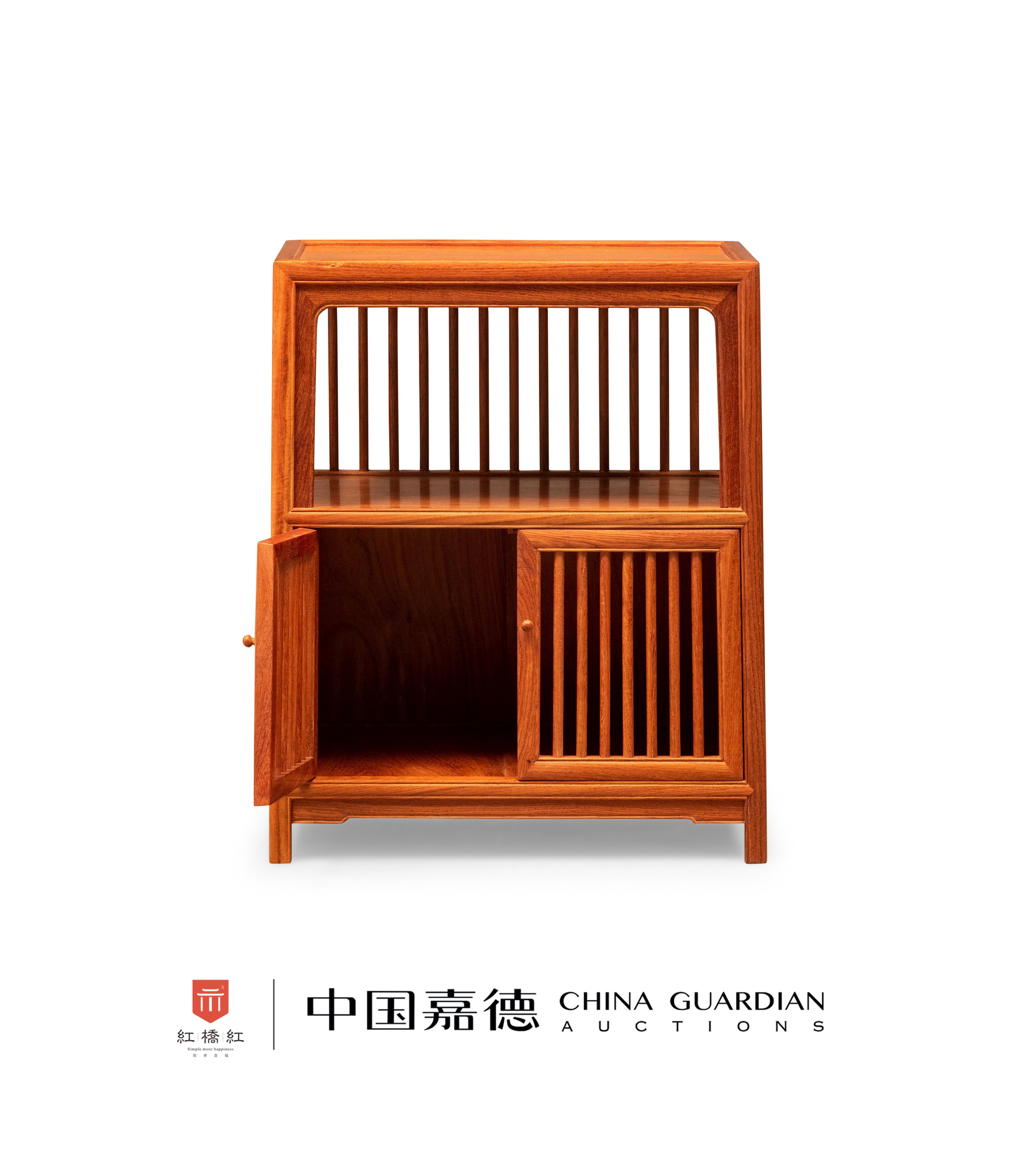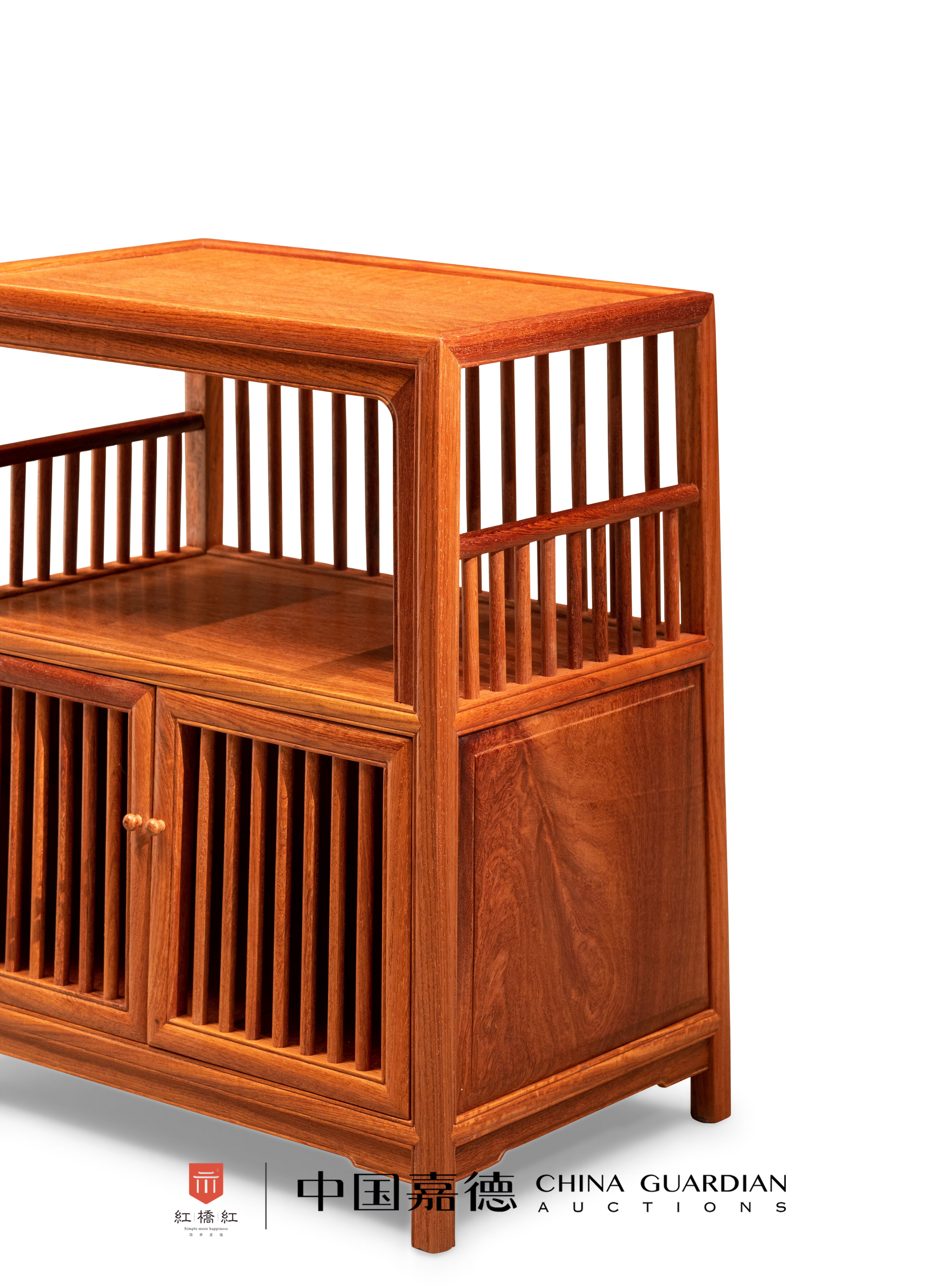 小茶柜以缅甸花梨木制,造型源于万历柜,上部为架,下部为柜。上部背板、两侧及下部柜门均为直棂式,疏朗通透。