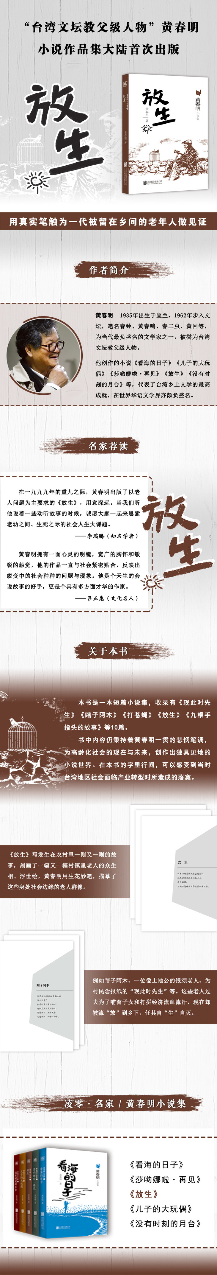 本书是一本短篇小说集,收录有《现此时先生》《瞎子阿木》《打苍蝇》《放生》《九根手指头的故事》等10篇。书中内容仍秉持着黄春明一贯的悲悯笔调,为高龄化社会的现在与未来,创作出独具见地的小说世界。在本书的字里行间,可以感受到当时台湾地区社会面临产业转型时所造成的落寞。《放生》写发生在农村里一则又一则的故事,刻画了一幅又一幅村镇里老人的众生相、浮世绘,黄春明用生花妙笔,描摹了这些身处社会边缘的老人群像,例如瞎子阿木、一位像土地公的银须老人、为村民念报纸的“现此时先生”等。这些老人过去为了哺育子女和打拼经济流血流汗,现在却被流“放”到乡下,任其自“生”自灭。