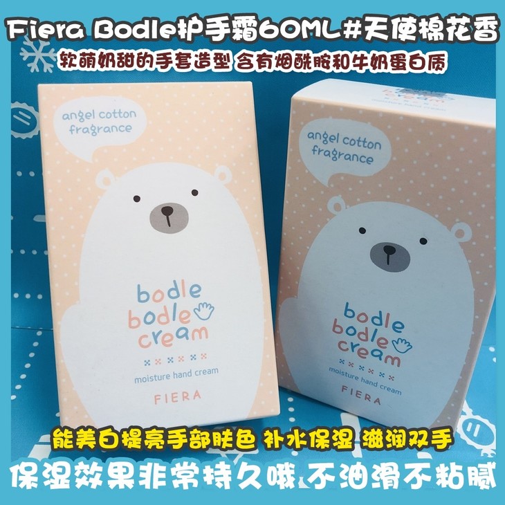 Fiera Bodle护手霜60ML#天使棉花香👍 软萌奶甜的手套造型👅,含有烟酰胺和牛奶蛋白质🥚,能美白提亮手部肤色🌟。补水保湿,滋润双手,保湿效果非常持久哦💦。不油滑不粘腻。小身材却有60ml容量😇,QQ萌萌,可可爱爱,一用就爱上啦,牛奶女孩喜欢到转圈圈🐄~