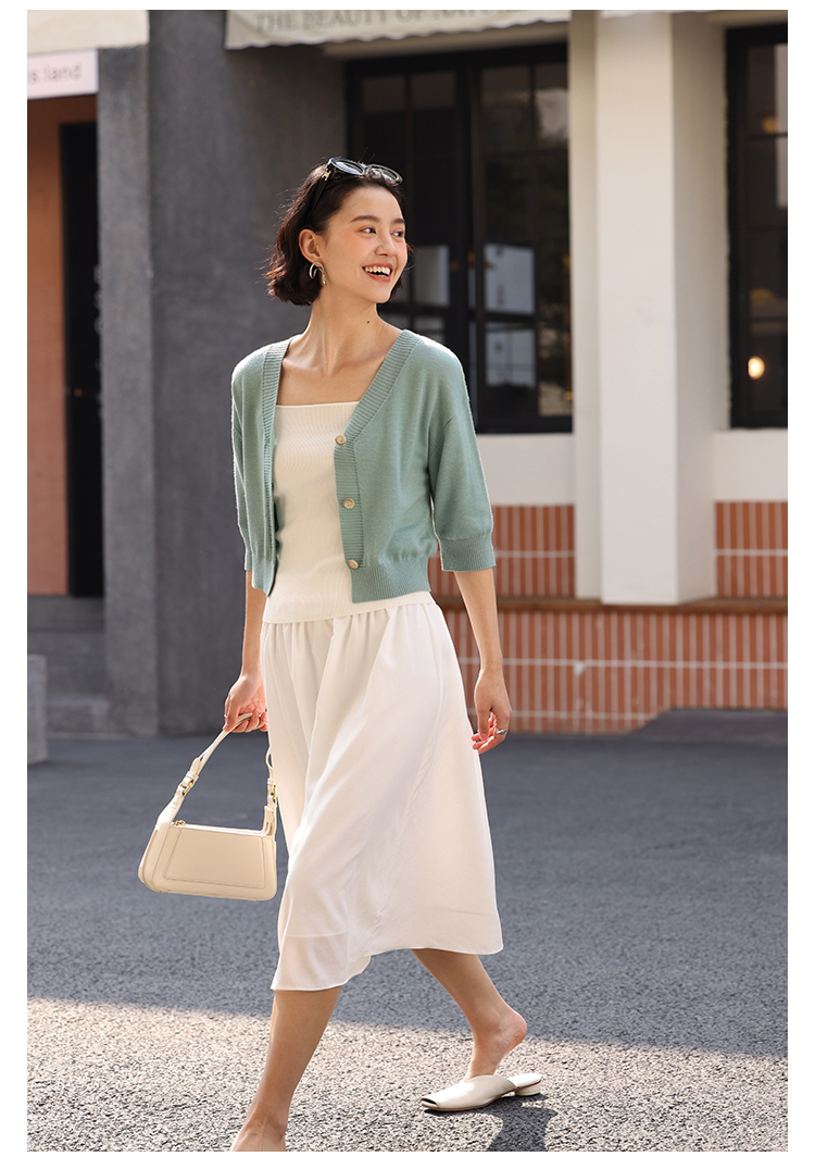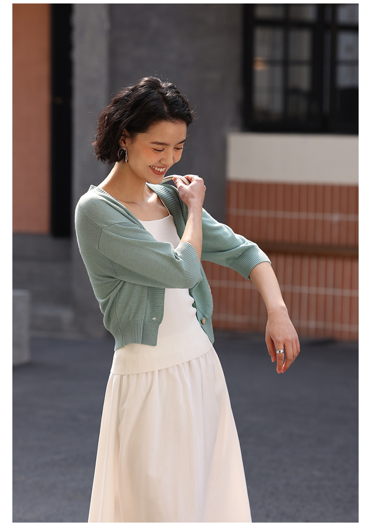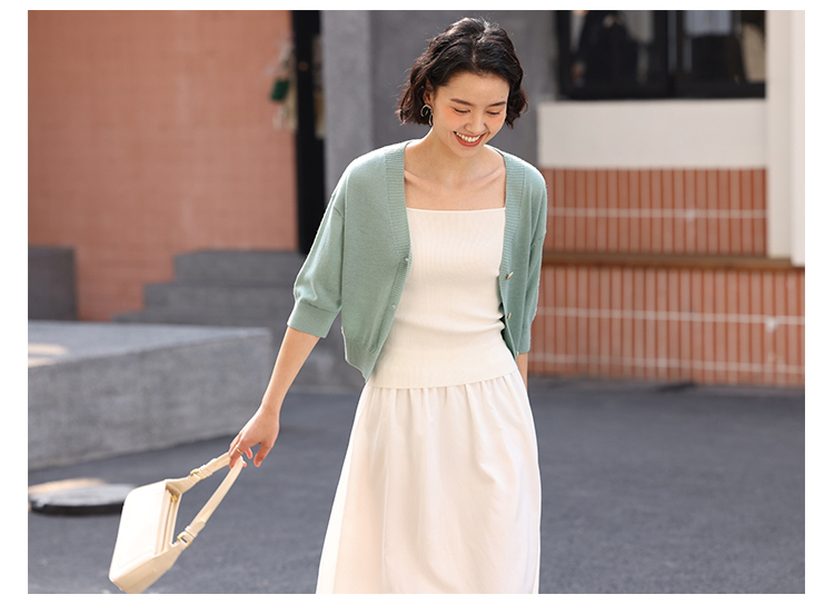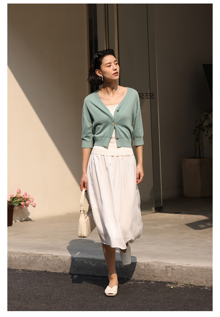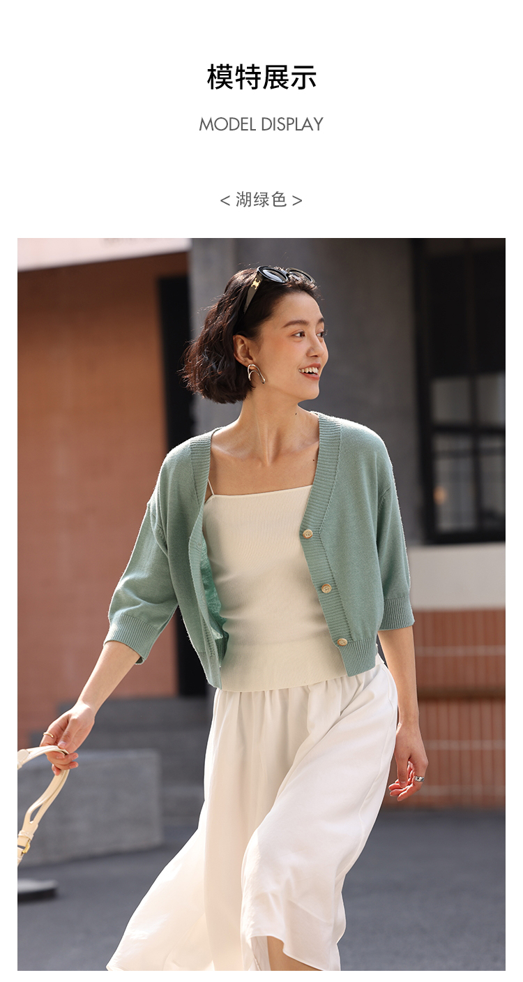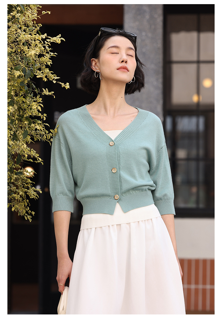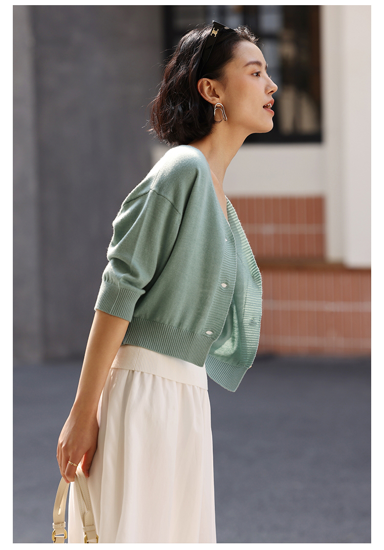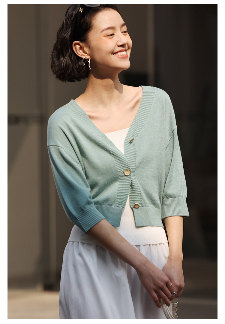 HeyDress法式针织开衫女春夏V领宽松收腰防晒衫中袖短款百搭上衣