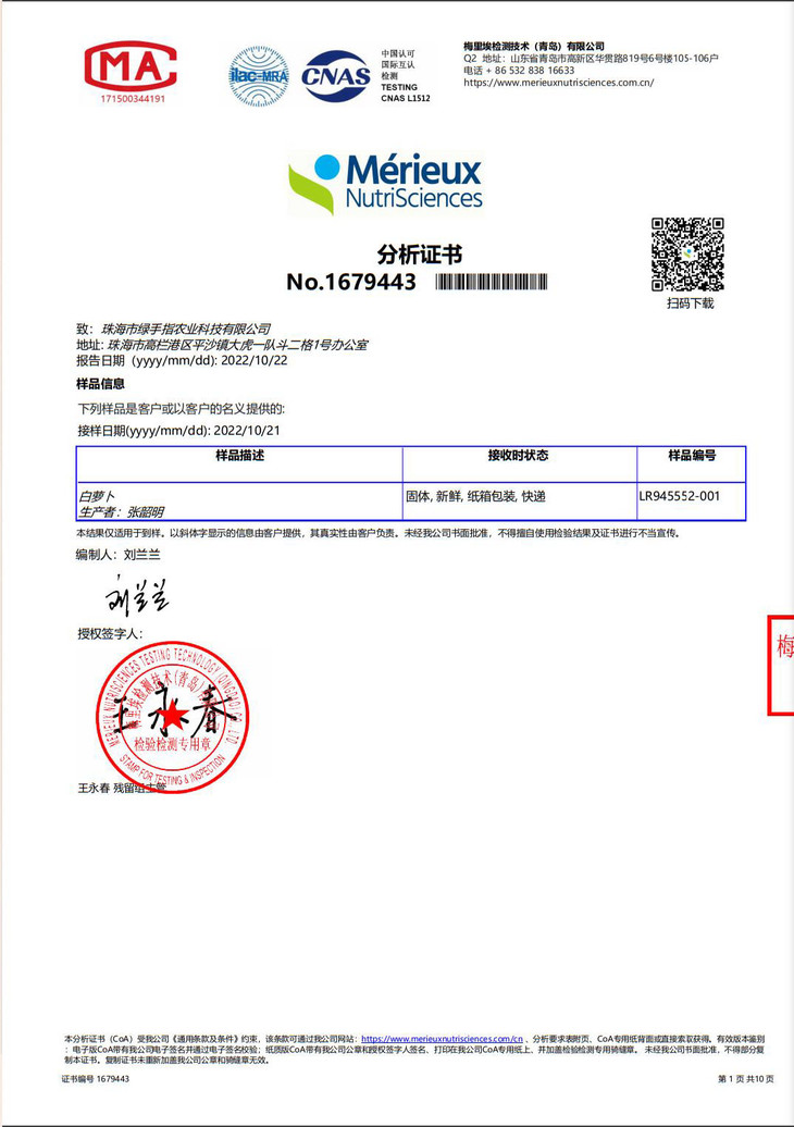农场也对萝卜进行了抽检,278项农残无检出