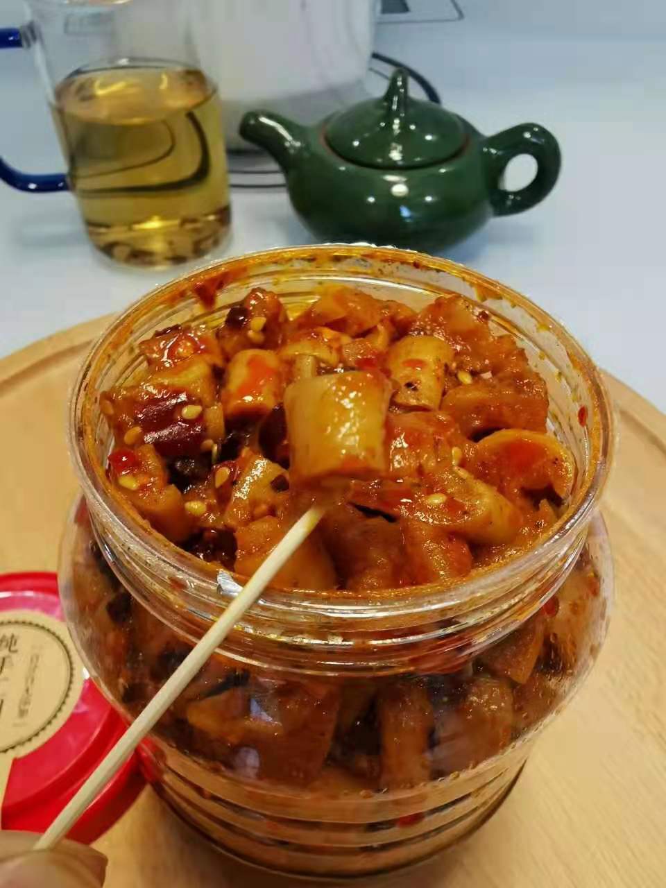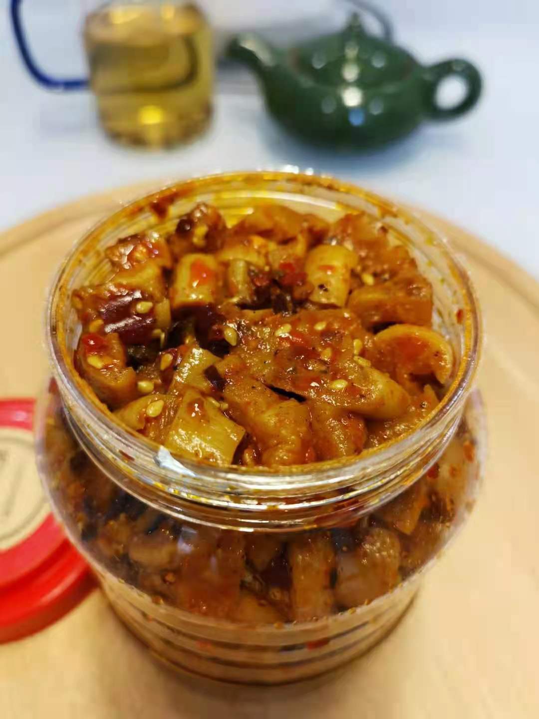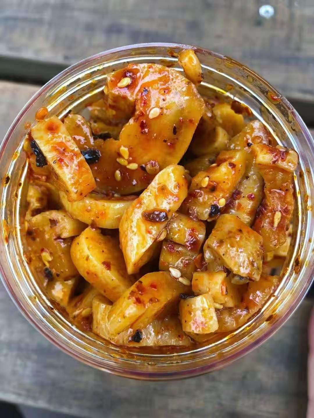 大白萝卜去心留皮切丁搓盐巴控干水分,佐以辣椒、芝麻等秘制配方腌制而成。嘎嘣脆,香辣微麻,回口有点甜~配粥/面条,极好的下饭菜!