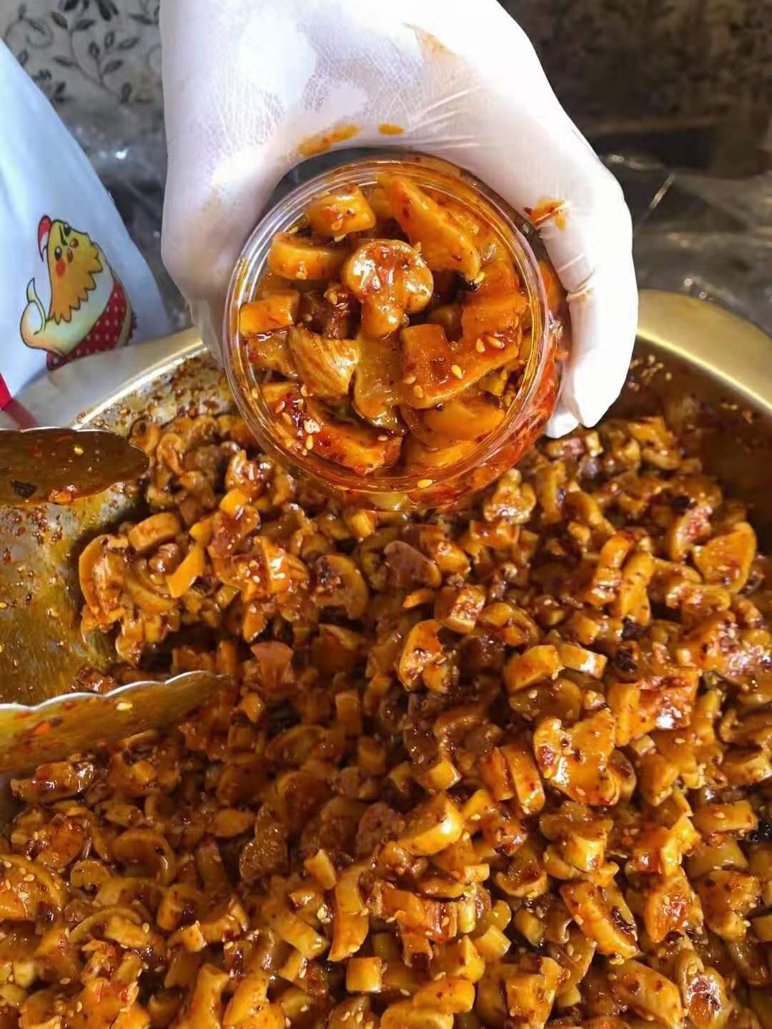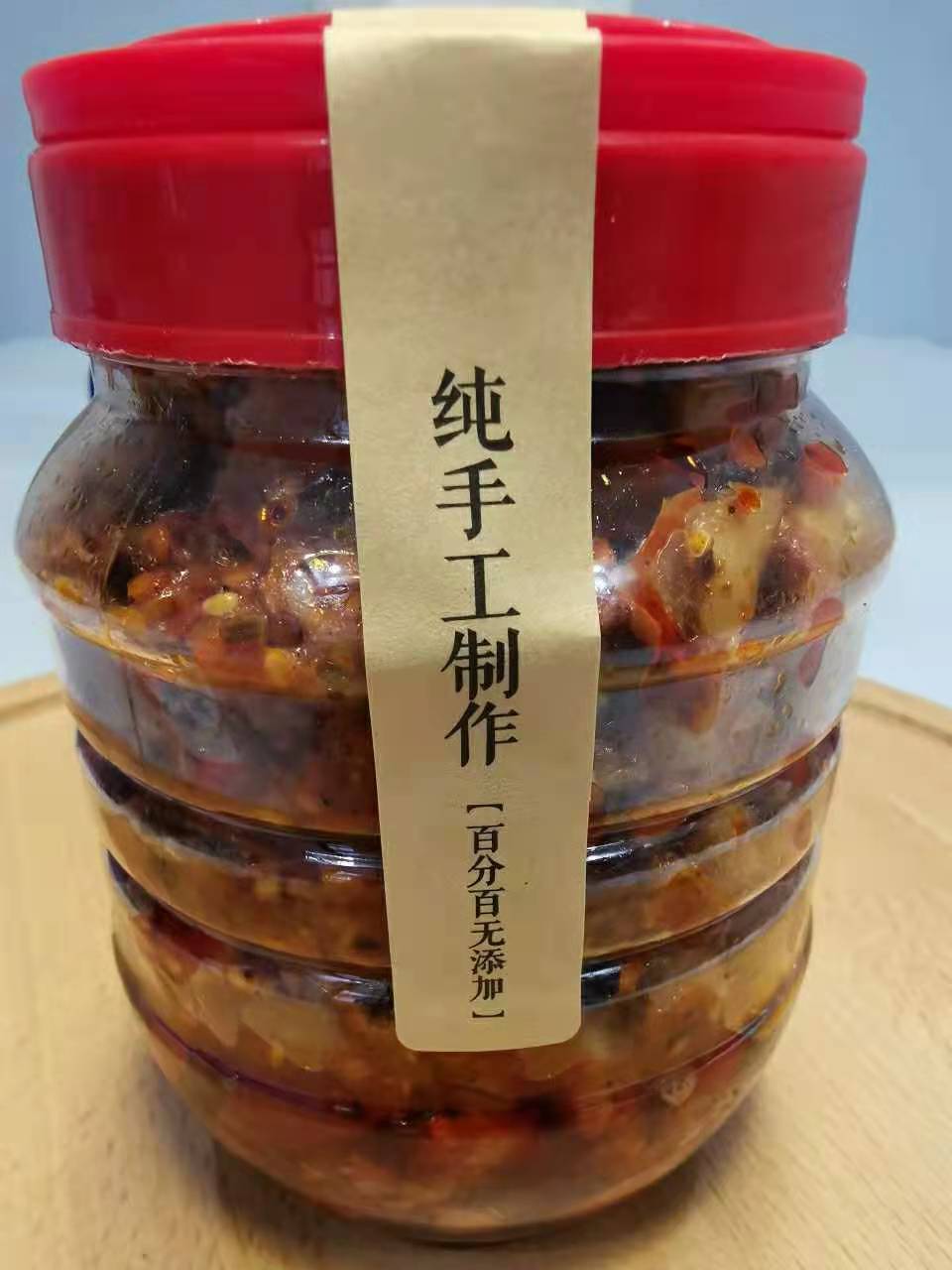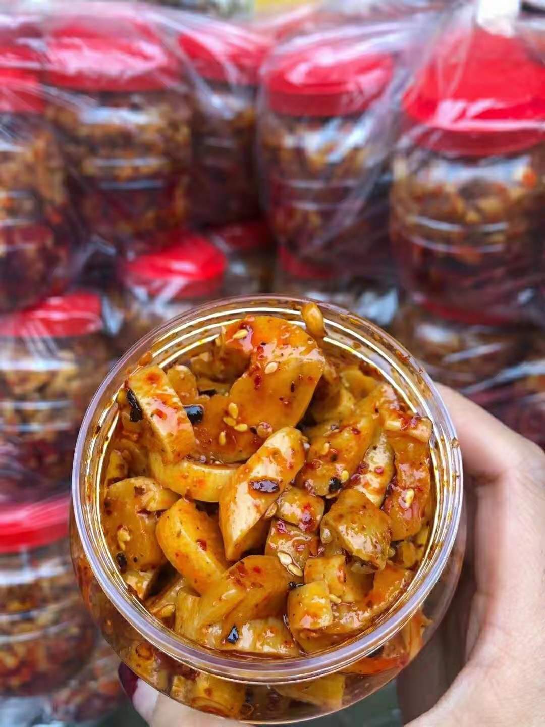 大白萝卜去心留皮切丁搓盐巴控干水分,佐以辣椒、芝麻等秘制配方腌制而成。嘎嘣脆,香辣微麻,回口有点甜~配粥/面条,极好的下饭菜!