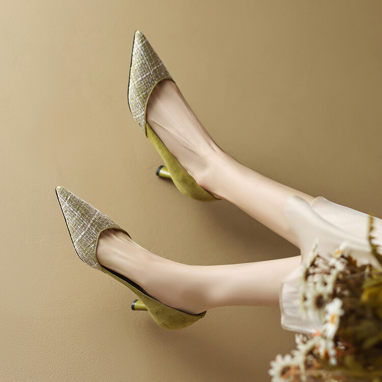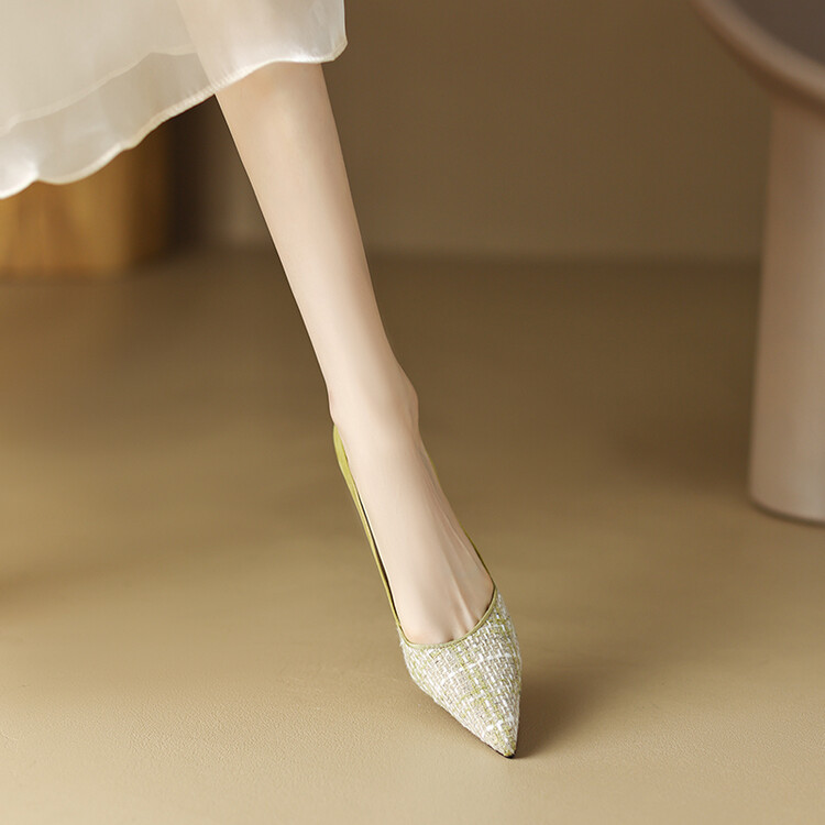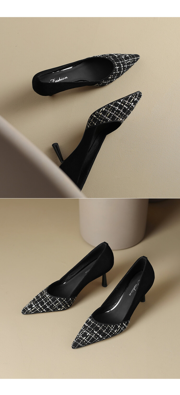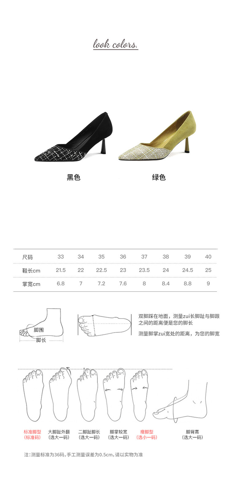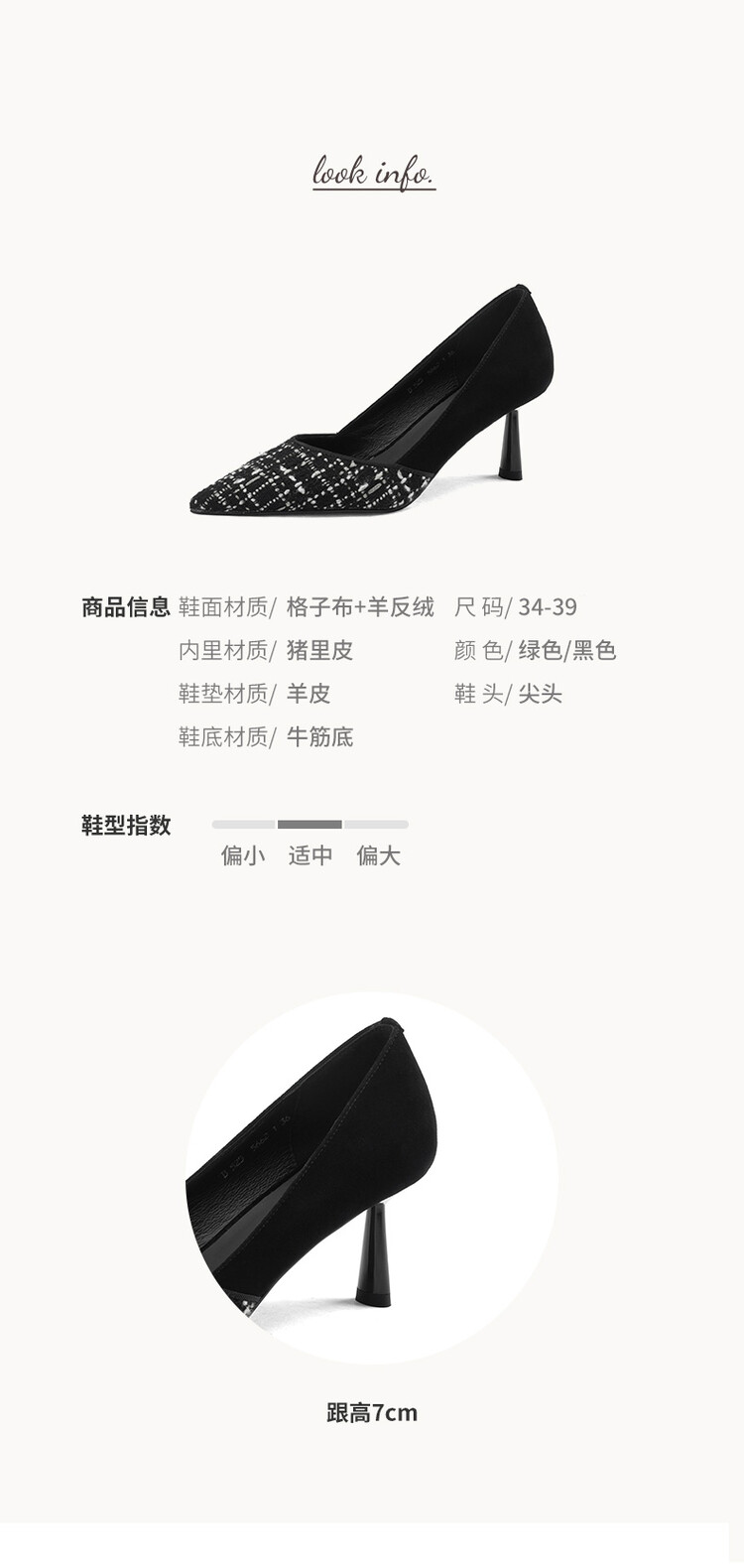 帮面材质:格子布/羊京内里材质:猪皮里鞋垫材质:羊皮垫鞋底材质:牛津大底颜色:黑色 绿色跟高:7CM尺码: 34 35 36 37 38 39