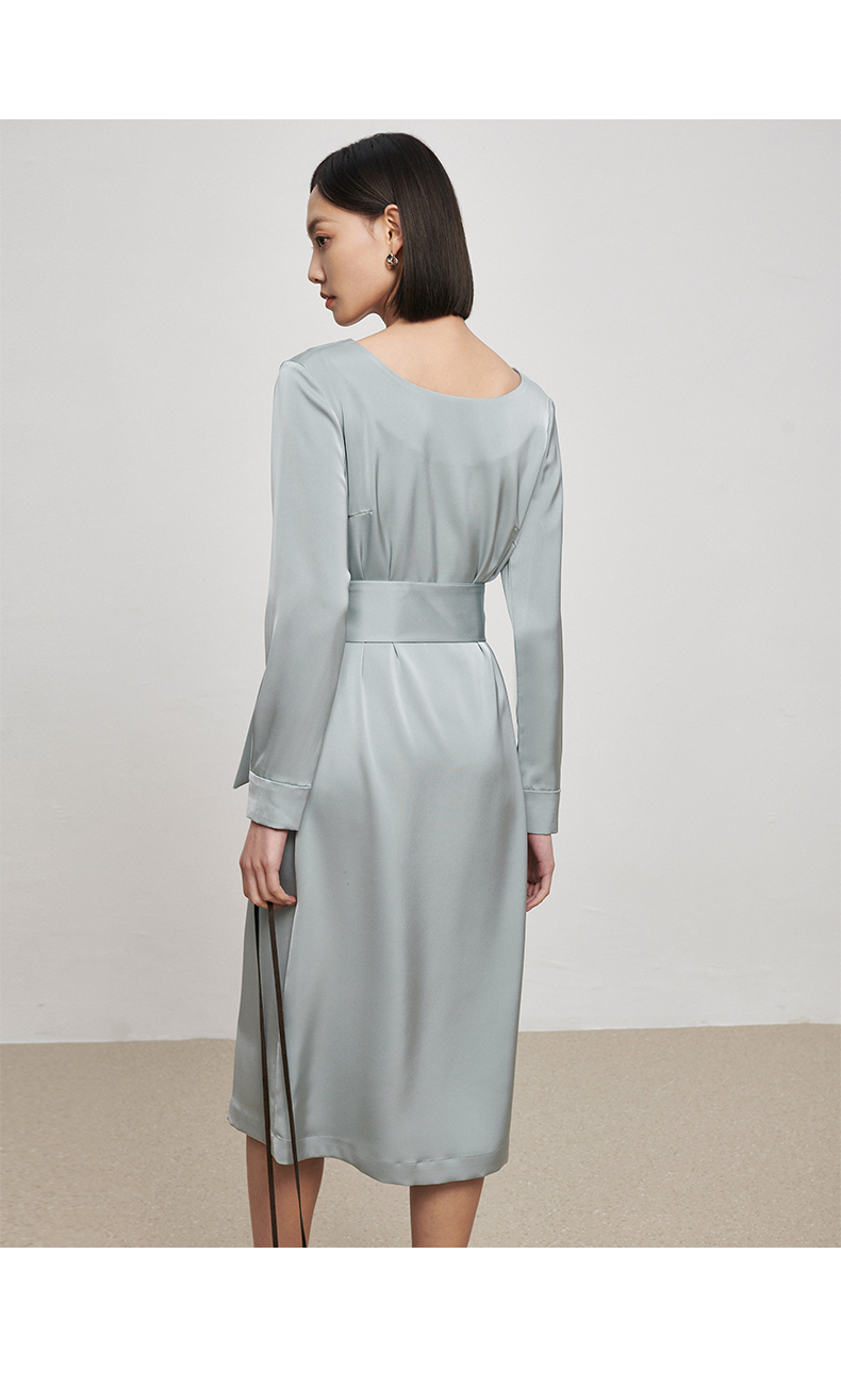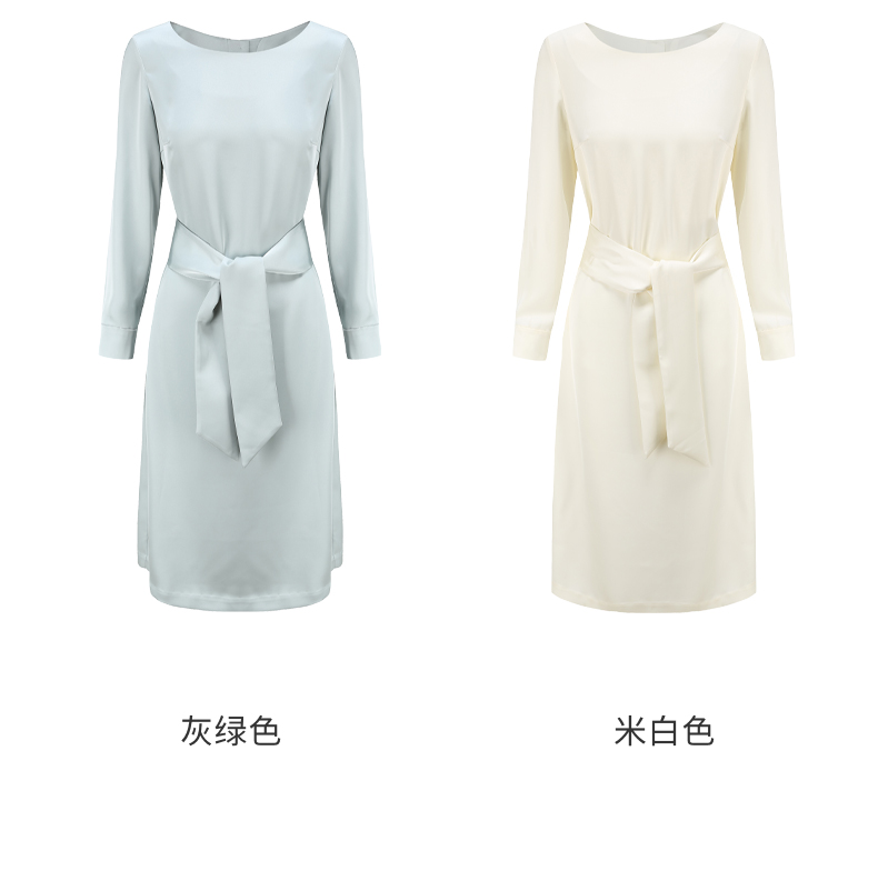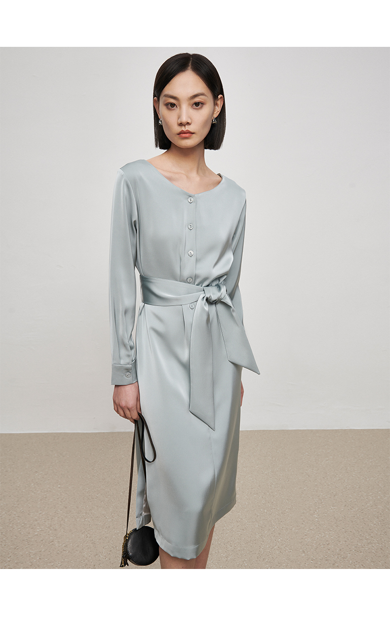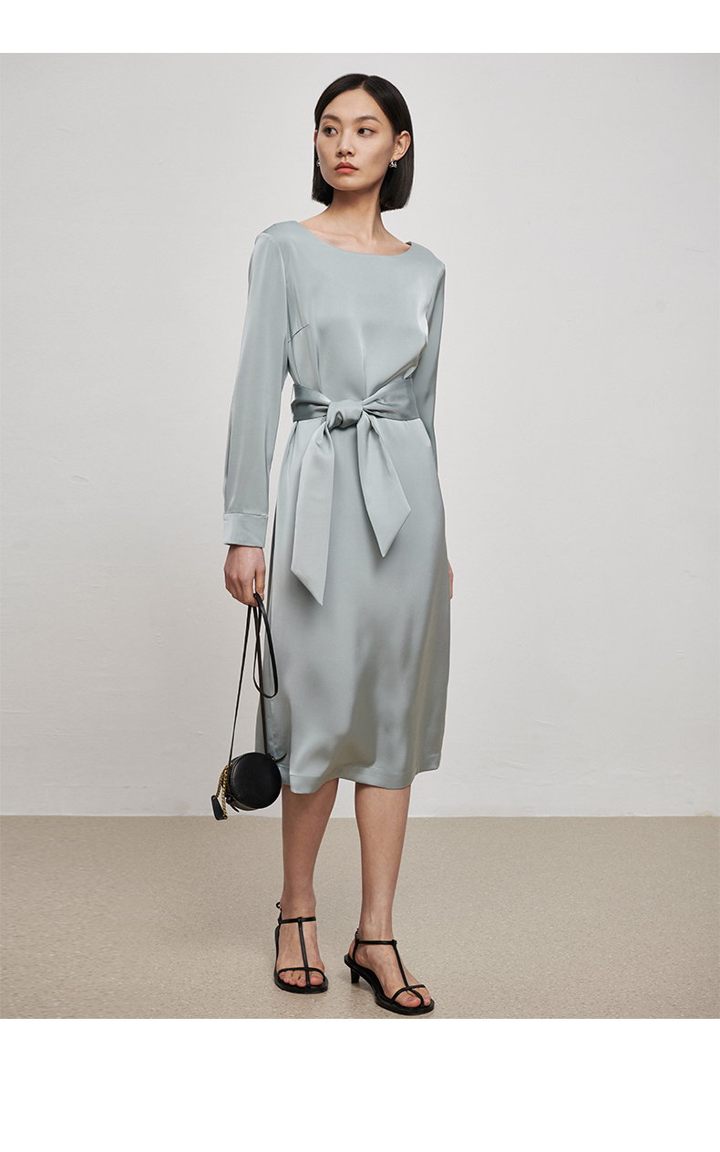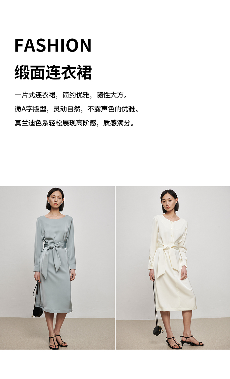 IN AND ON21726高定质感缎面连衣裙女一片式收腰圆领A字裙
