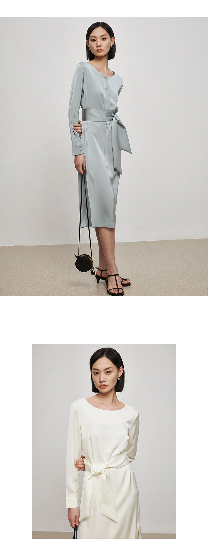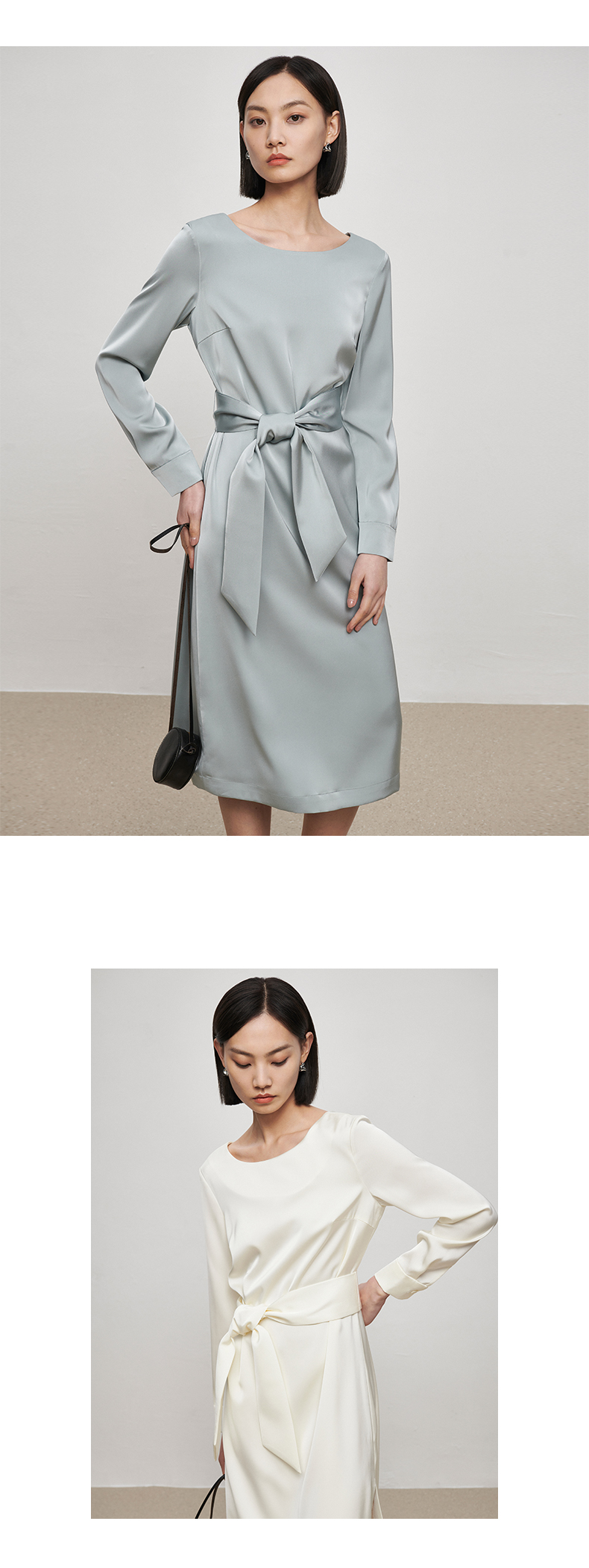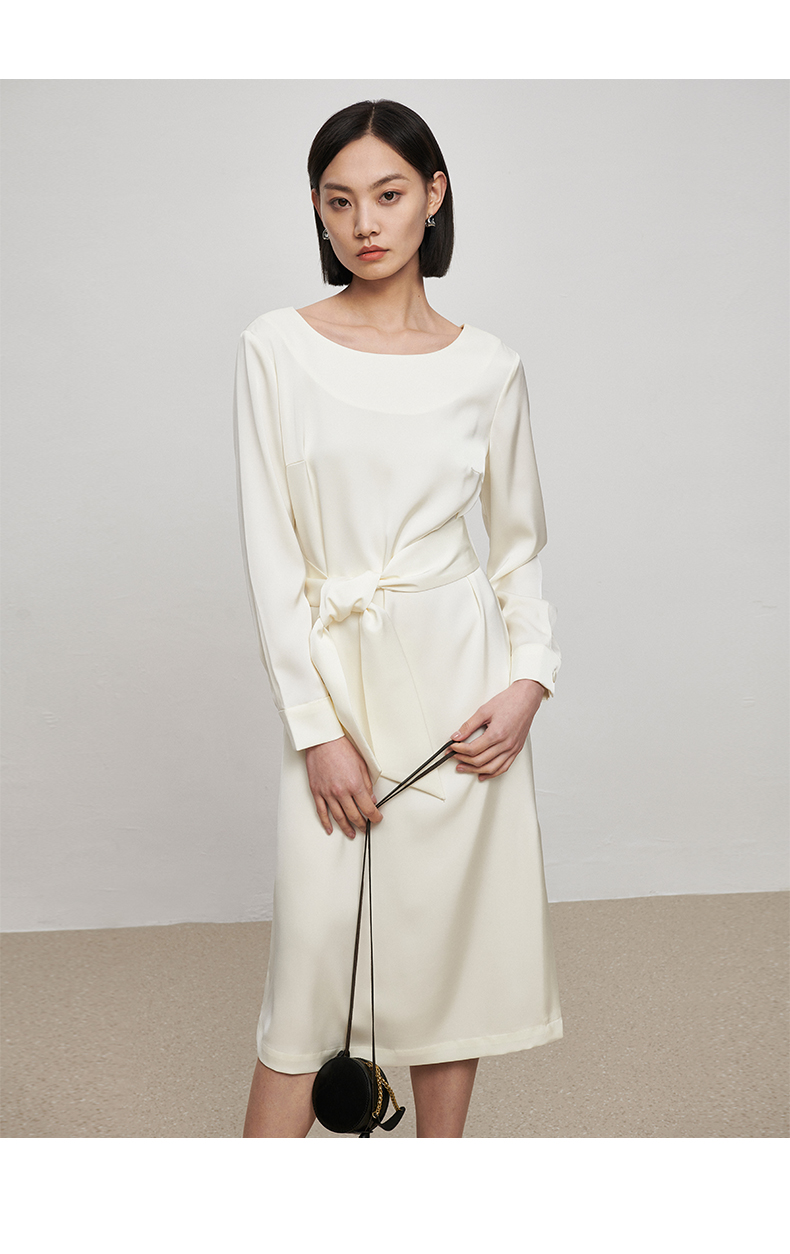 IN AND ON21726高定质感缎面连衣裙女一片式收腰圆领A字裙