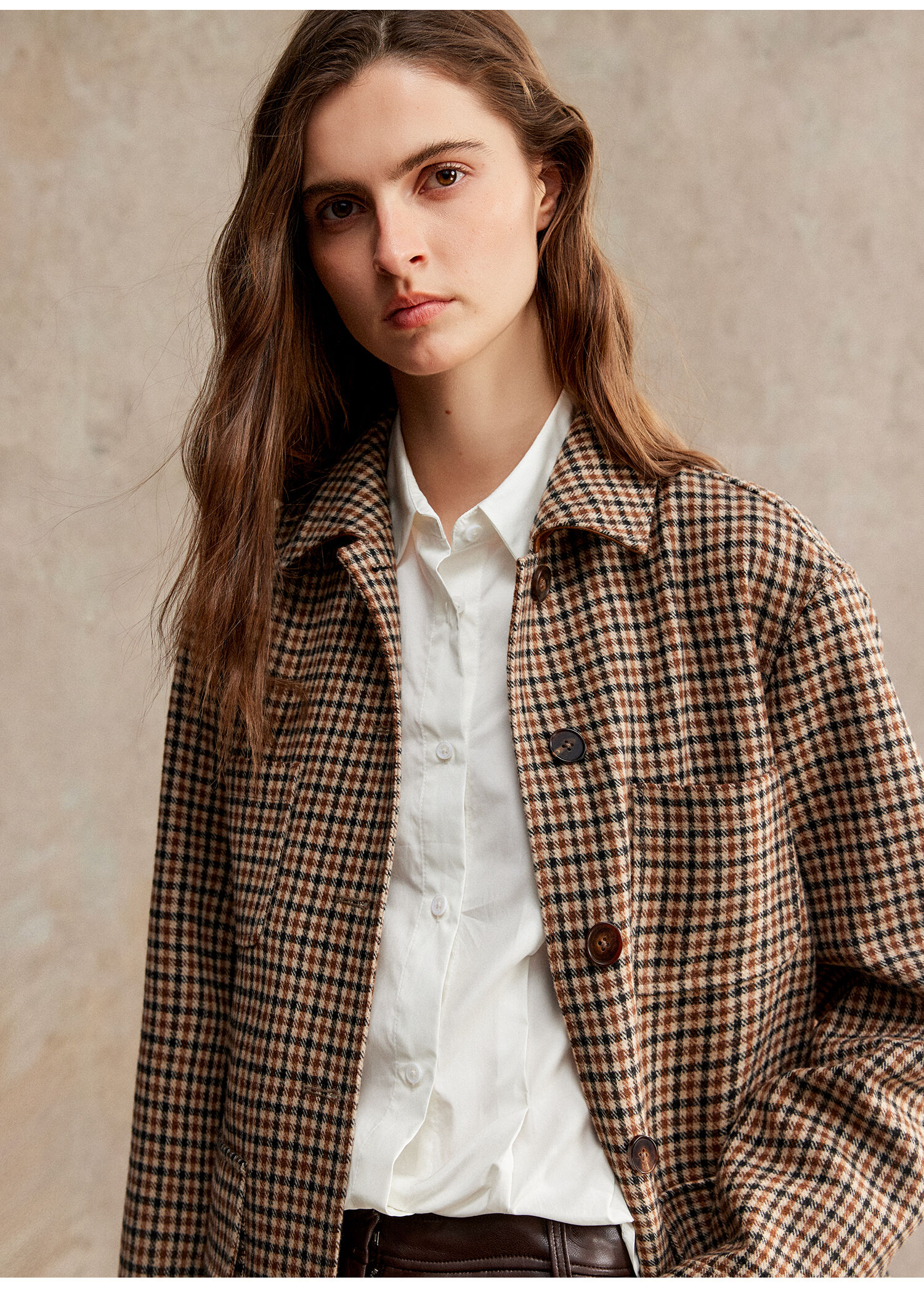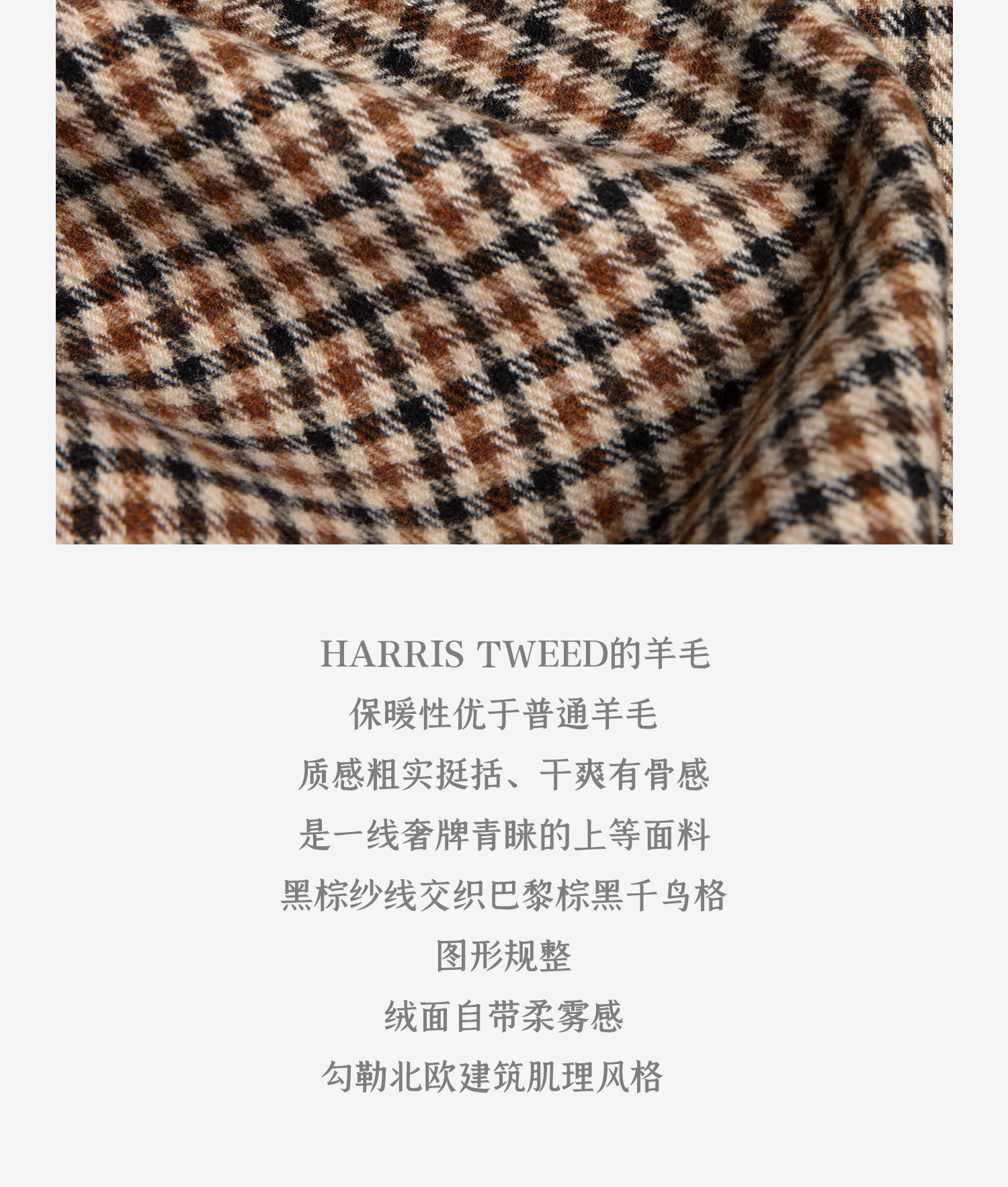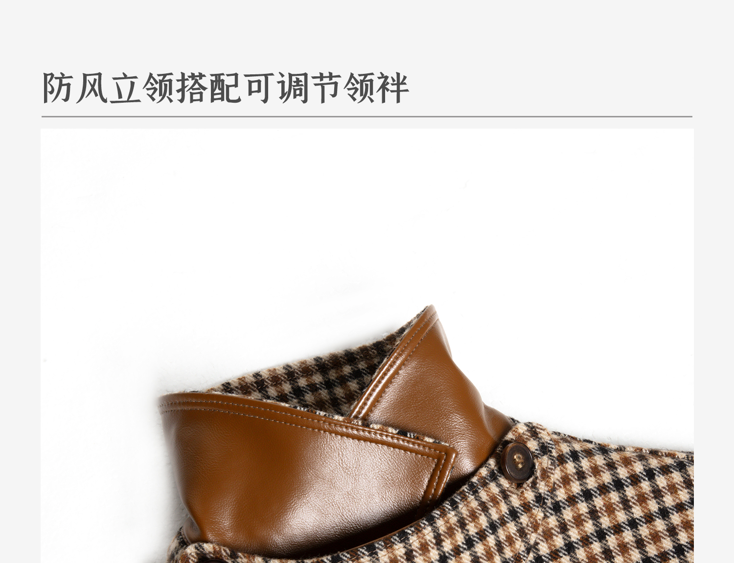 羊毛千鸟格复古老钱风拼接皮领毛呢外套