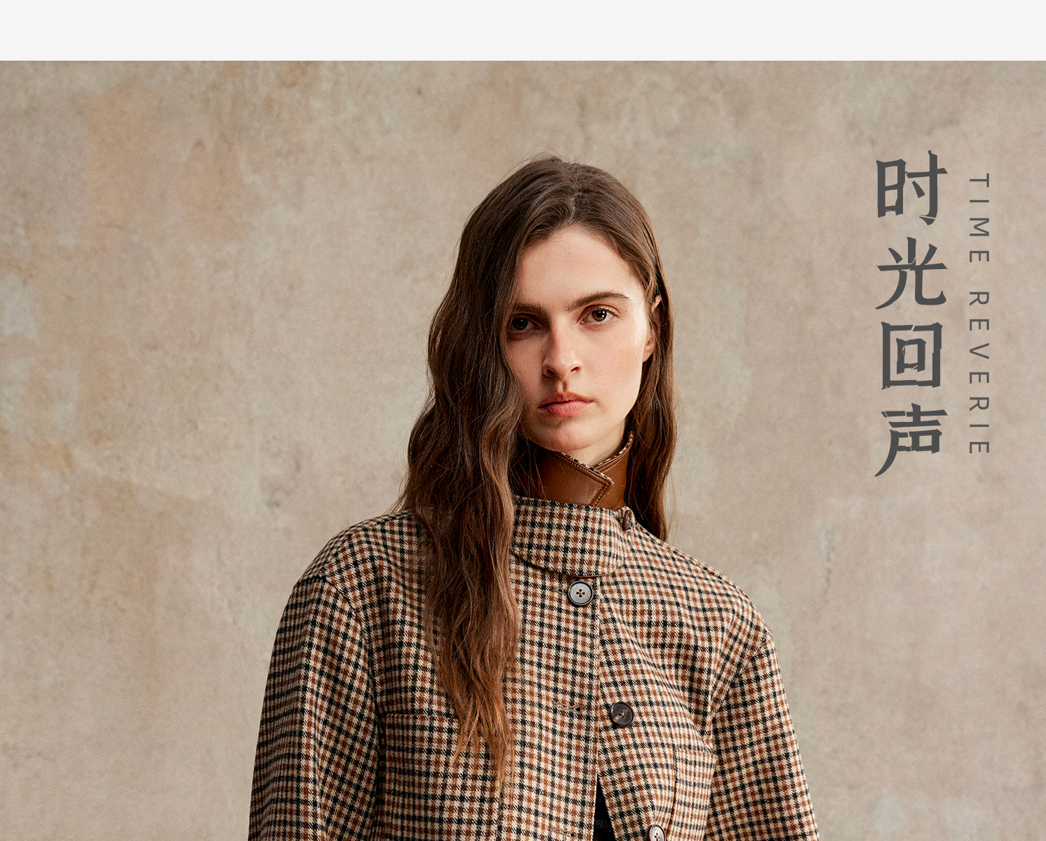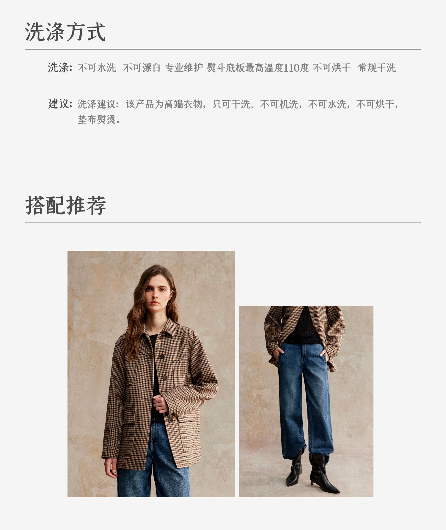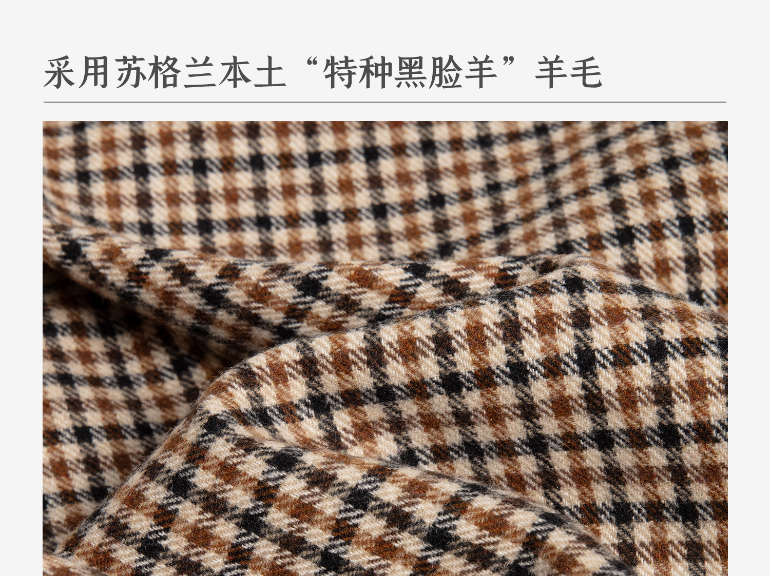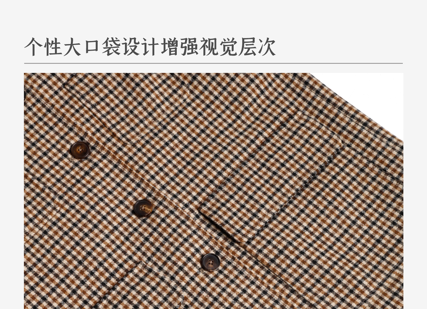 羊毛千鸟格复古老钱风拼接皮领毛呢外套