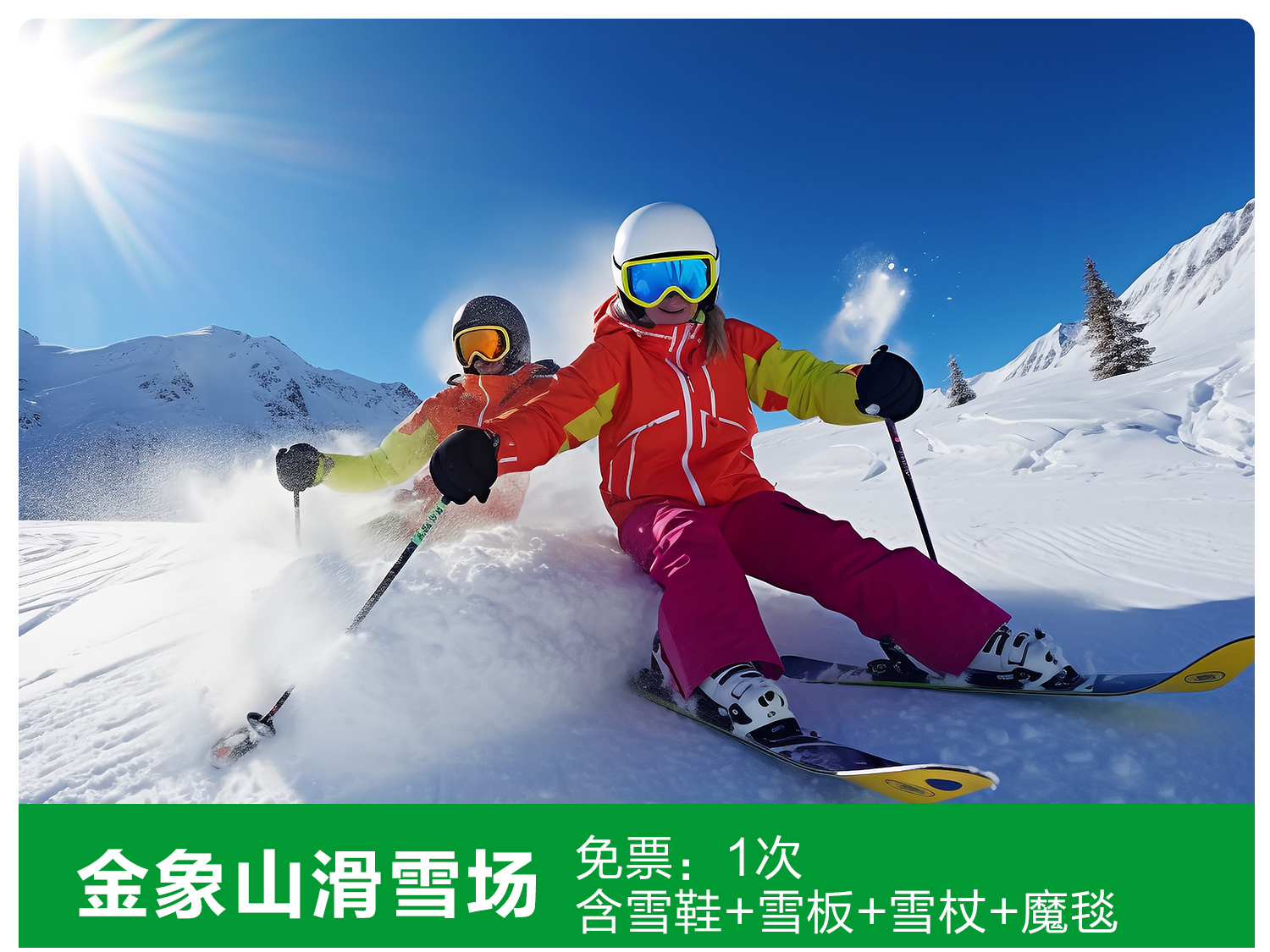 12、金象山滑雪场:济南最专业的滑雪场,专业滑雪爱好者的选择!初级、高级道都有!含门票 雪板 雪鞋 雪杖;包含滑雪1次;整个雪季的周一至周日通用(春节期间2月15日-2月23日不可用);当天预约 当天可用,进"齐鲁畅游宝"小程序预约。