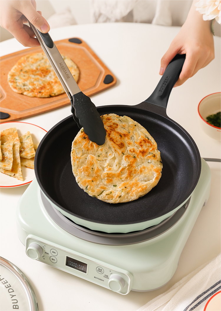 加厚大平底,无论是在电磁炉、电陶炉还是燃气灶明火使用,都能让热量从锅底均匀传递到食物上,新手也能煎出黄金色泽的煎饼!