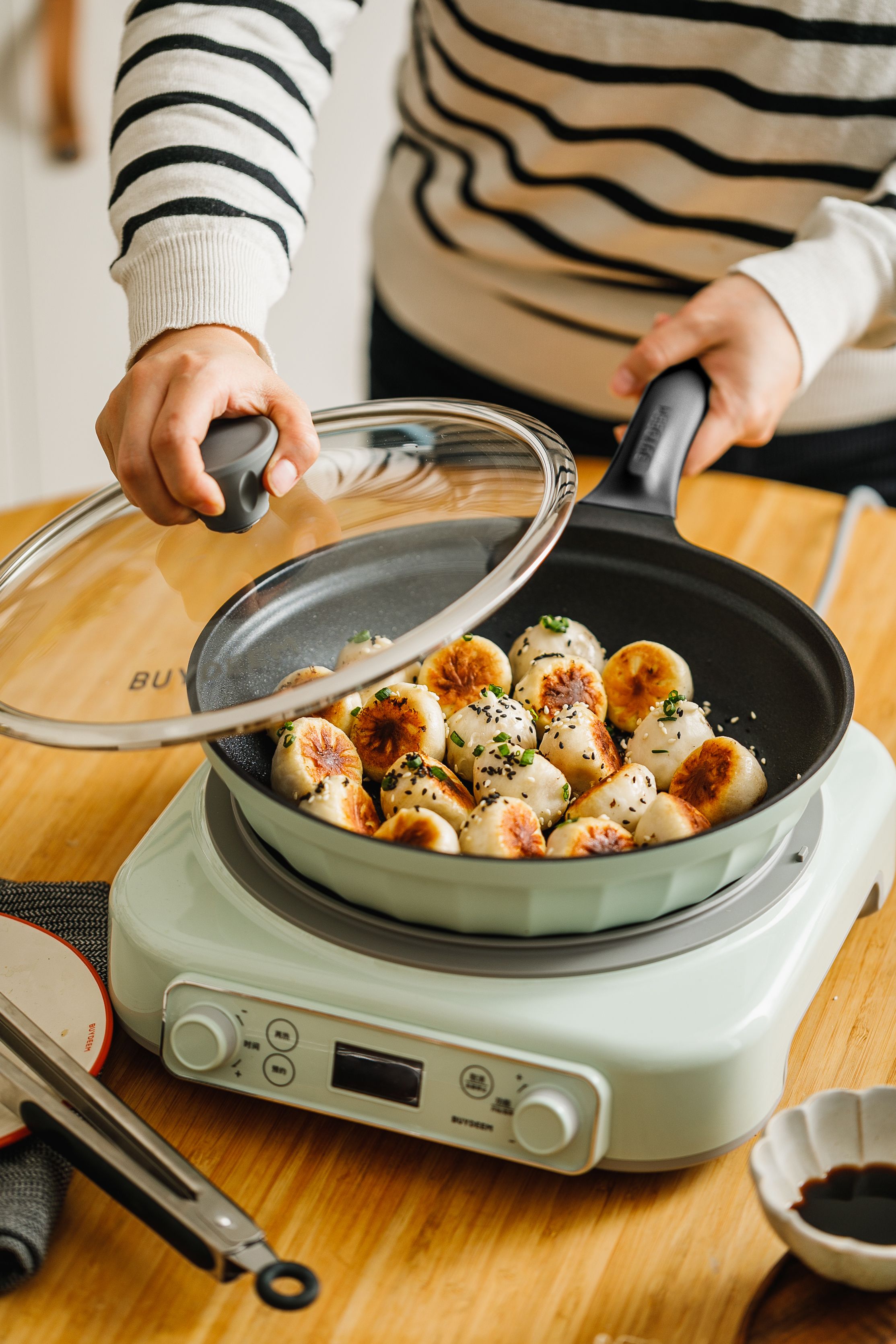 想给全家做份生煎早餐,没问题!包在不粘平底煎锅身上。2.4L实用容量轻松填饱全家胃,能一次性放16个生煎包,不再来回做两次啦。