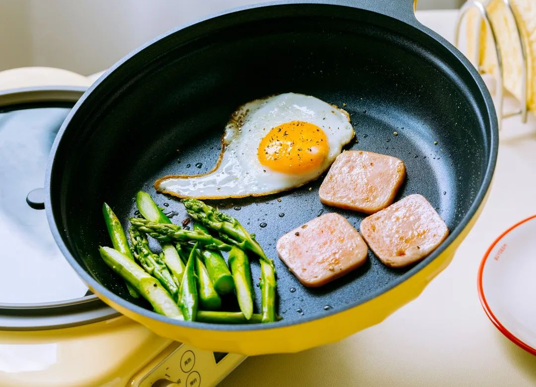煎锅大平底底部直径有20cm,2.4L实用容量,轻松放入煎蛋、午餐肉、烤肠、芦笋,有菜有肉营养均衡,吃的超满足。