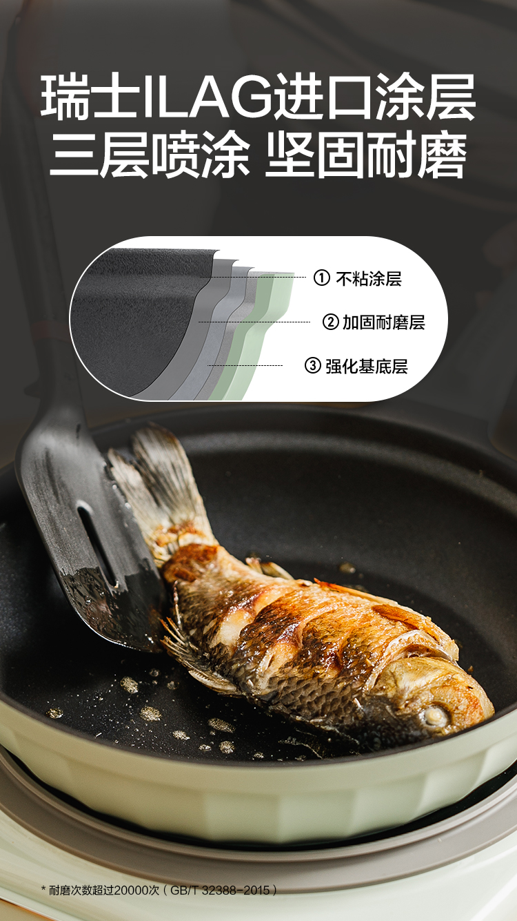 可以做到无油煎蛋也不粘,符合国家GB/TI级不粘标准。而不粘涂层的耐磨性和使用的持久性也是有口皆碑,即便是耐磨15,000次后仍可达到I级不粘标准哦~