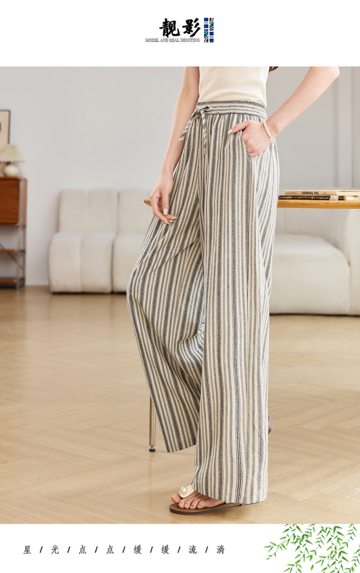 百媚生 休闲条纹阔腿裤抽绳松紧高腰直筒裤BKDYL241 商品图2