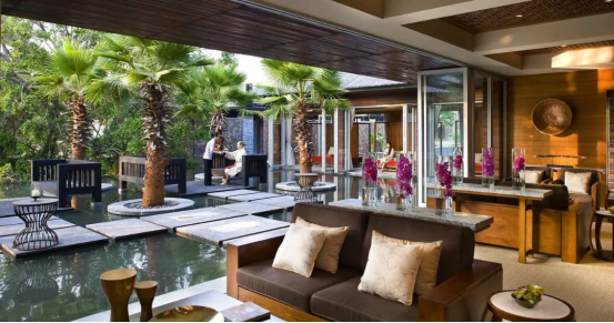 走进2层楼高半开放式大堂,乍一看还有些许巴厘岛瑞吉的既视感,几乎是Bill Bensley同时期的作品。