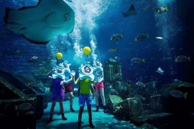 如果会游泳潜水就可以参加亚特兰蒂斯潜水项目,和水族馆内海洋生物结伴畅游;不会游泳的你也有解决方案,戴着头套海底漫步。
