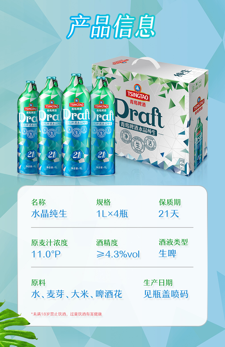 青岛啤酒21天水晶纯生11度1L*4桶礼盒装