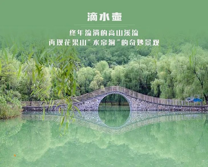 滴水壶是一个形式独特的湖泊,由于落差大约20多米,水声轰鸣,且瀑布的上部较小,犹如壶倾出的水,故又名“滴水壶”。