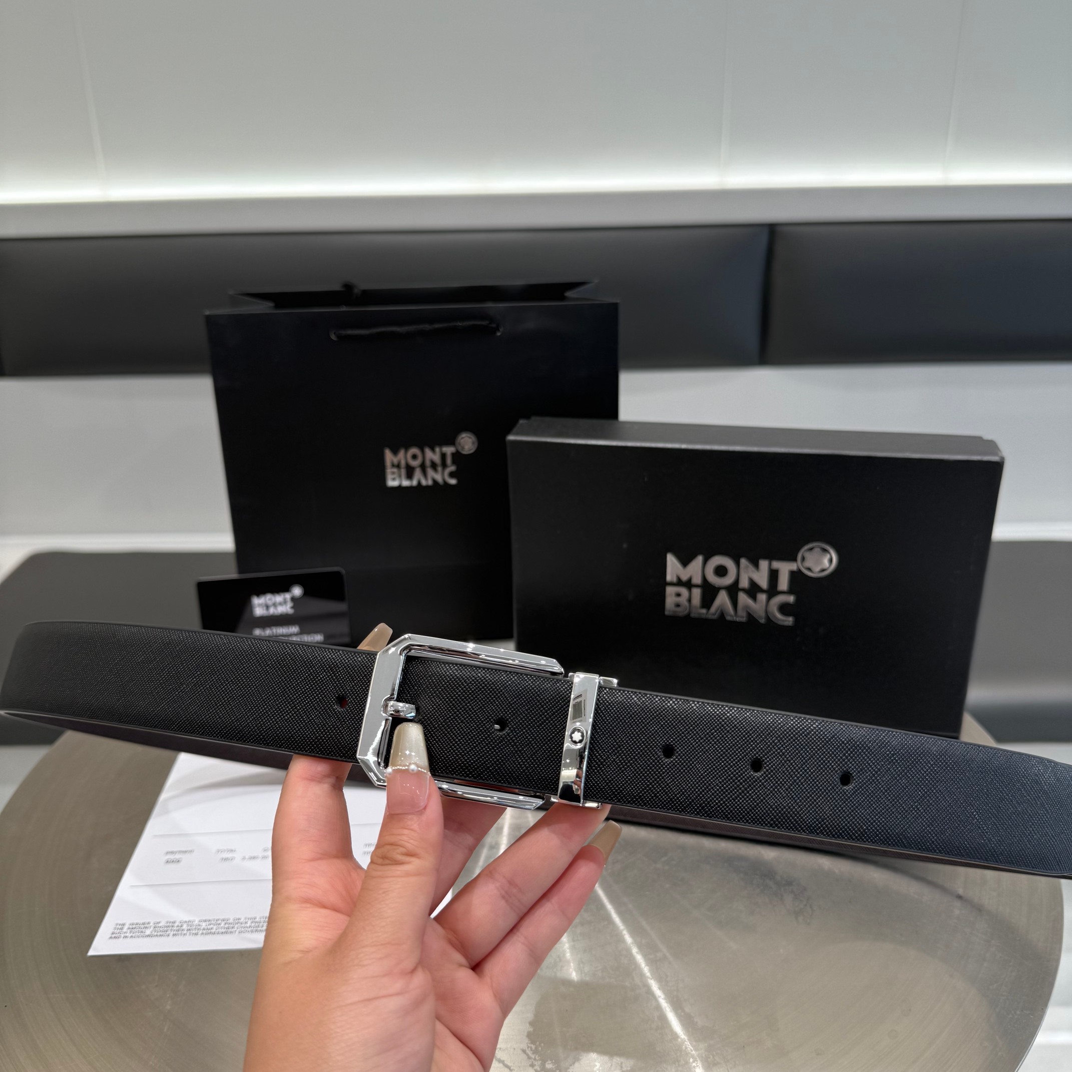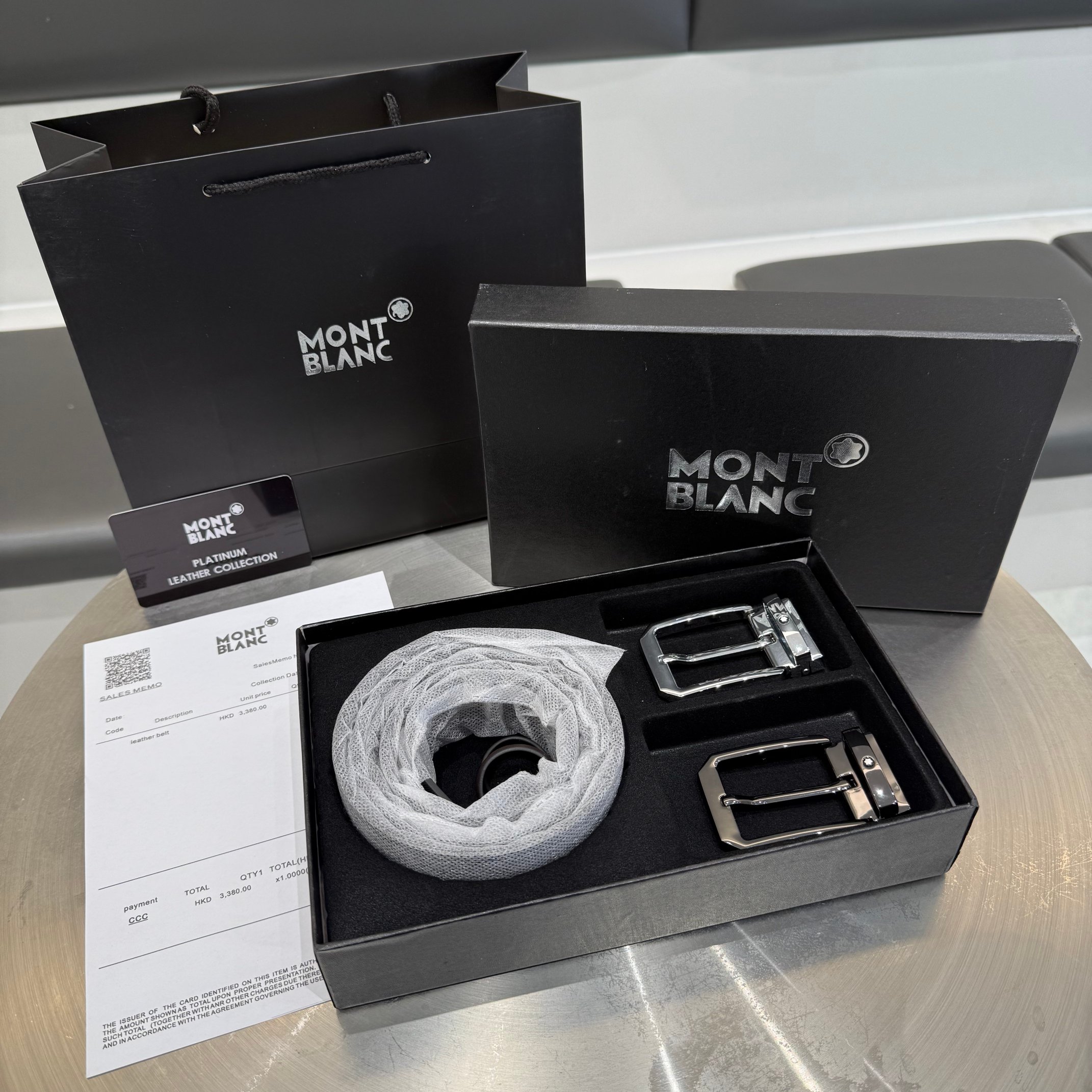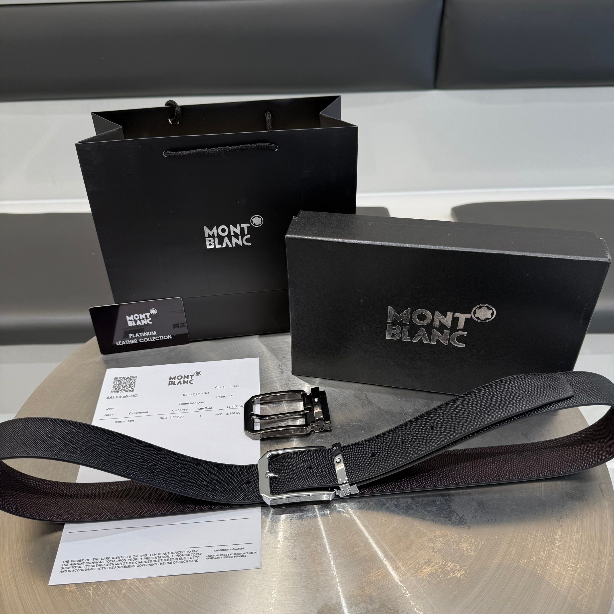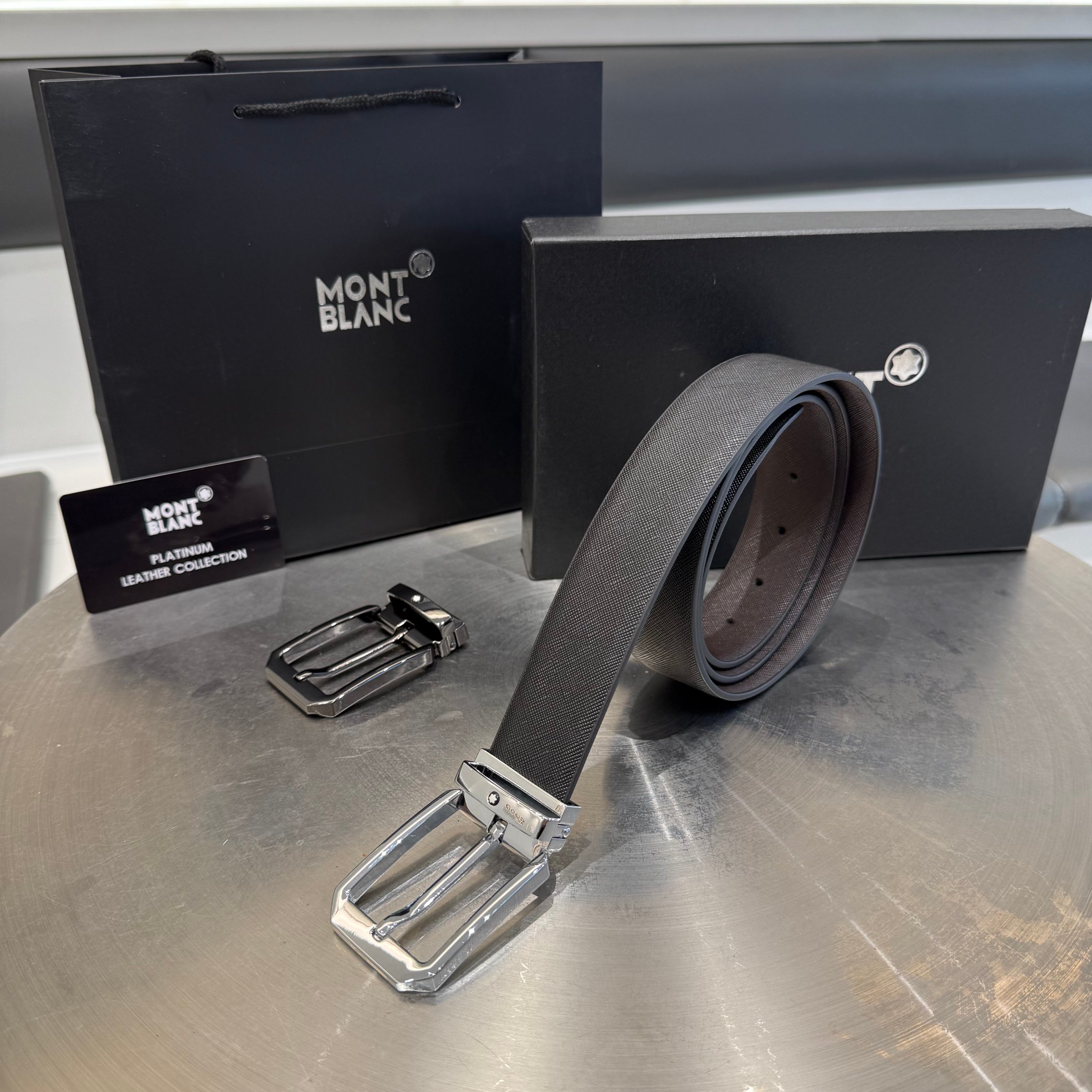 Montblanc万宝龙25年新款男士M双扣商务休闲皮带腰带礼盒装男士经典款,出口德国货!!一盒含:2个扣头+1条双面皮带!!带身一面黑色一面棕色。花了一条皮带的钱买四条!标志性设计呈现给敢于追求内心热爱,开拓自我成功之路的年轻!!真正的低调奢华.. 均码可截断,全套包装! 宽度 3.5cm,长度 120cm。 东西好到爆...皮质手感 绝对罕见!!!牛皮材质,手感滑滑的很有光泽,在经过针扣压印工艺,手感更佳突出!!万宝龙顶级一线奢侈...男人必入款式...送男士礼物首选!这款万宝龙的皮带双面都可以使用,可商务可休闲,适合正装,也适合日常穿搭~想给男士选一款低调又不失品味的皮带,万宝龙这款一定要考虑,强烈推荐!