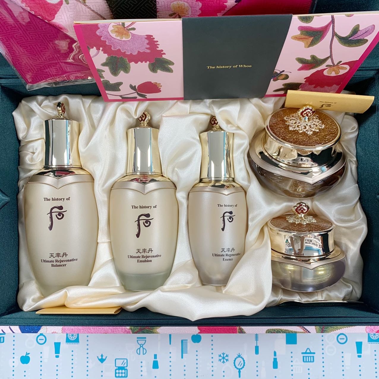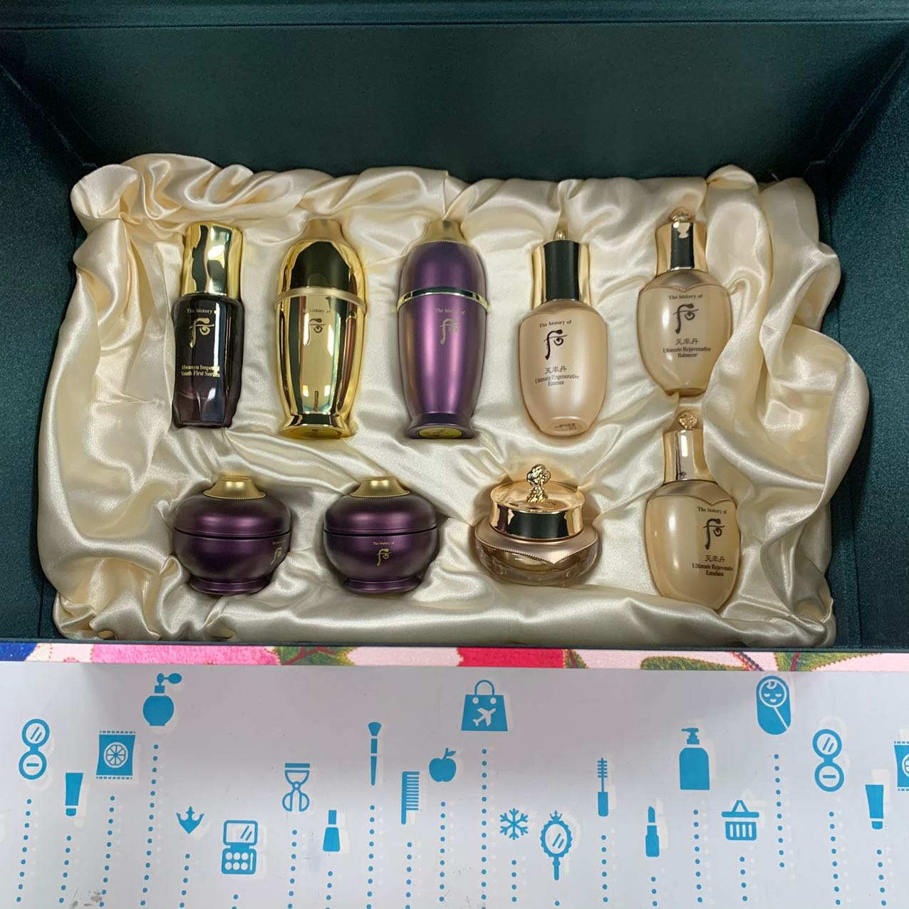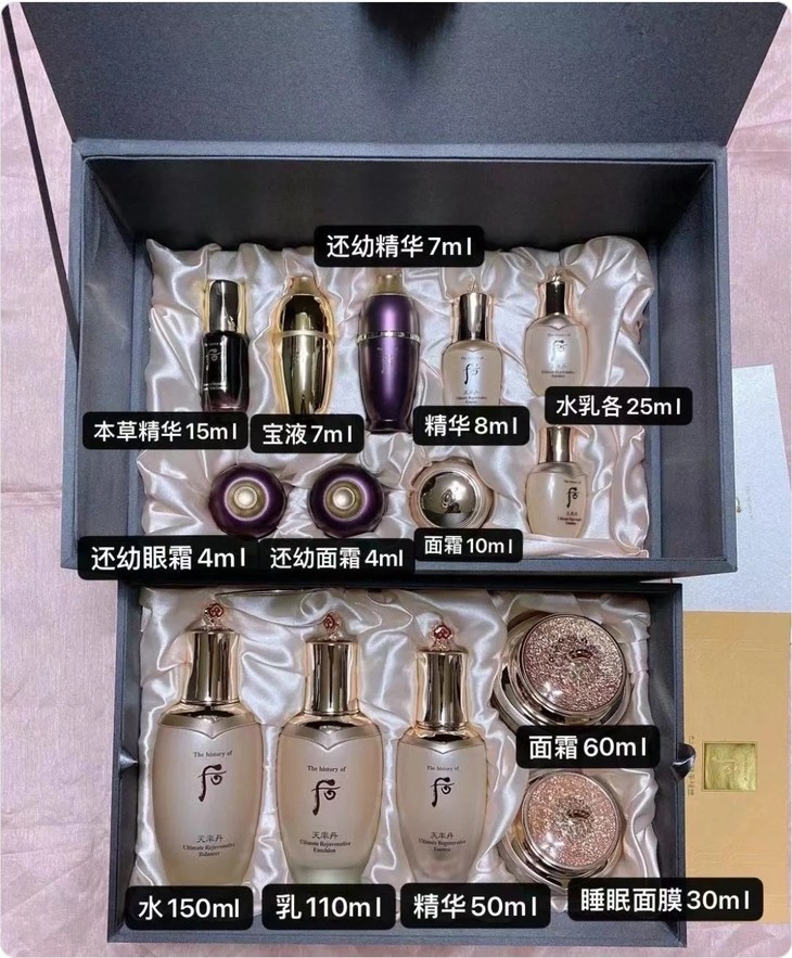 WHOO 太后套 |👍 此款是WHOO品牌里最高端的系列📣!贵有贵的道理💰,爽肤水里面还有黄金小颗粒🙈,有很强的修复功效✔️,再生换肤✔️,提升皮肤弹性和光泽✔️,调节皮肤水油平衡✔️,持久保湿✔️,侧重增加肌肤弹力✔️,抵抗皮肤下垂✔️。此款适合所有肤质🉑!赠品全是还幼天率丹😍,比单买更划算🌈,想要颜逆龄的集美看过来啦~👀 【套盒包括】:水150ml+乳110ml+精華50ml+面霜60ml+睡眠面膜30ml+本草精华15ml+宝液7ml+还幼精华7ml+精华8ml+水25ml+乳25ml+面霜10ml+眼霜4ml+面霜4ml