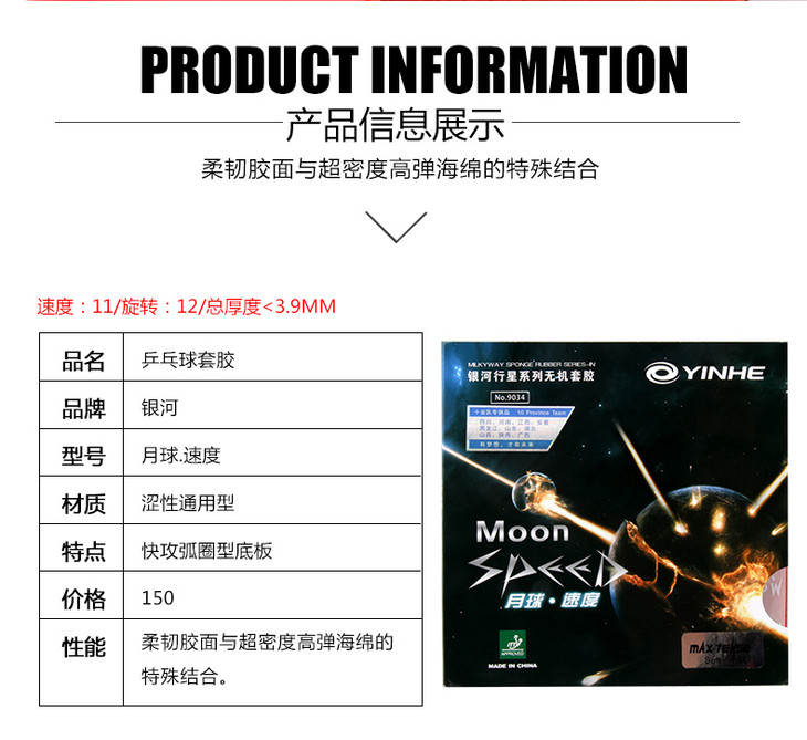 YINHE银河 MOON月球速度型月亮无机涩性乒乓球胶皮球拍反胶套胶