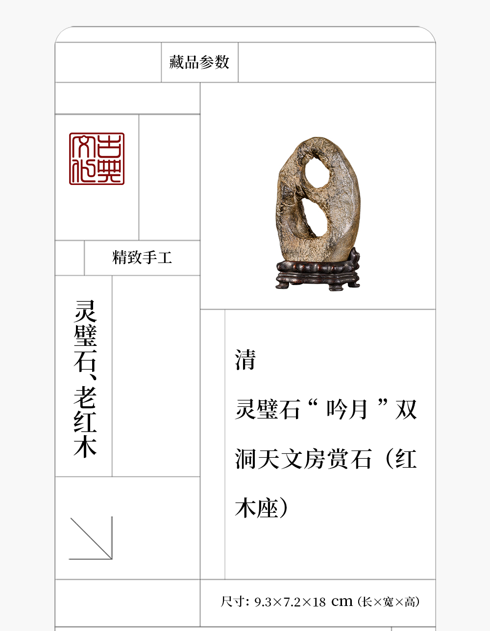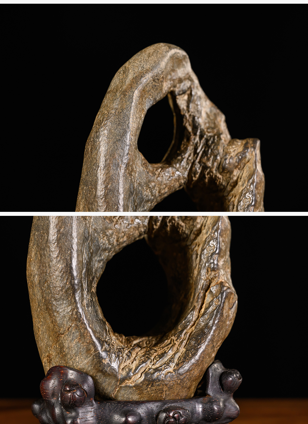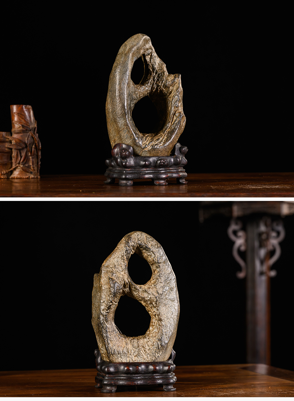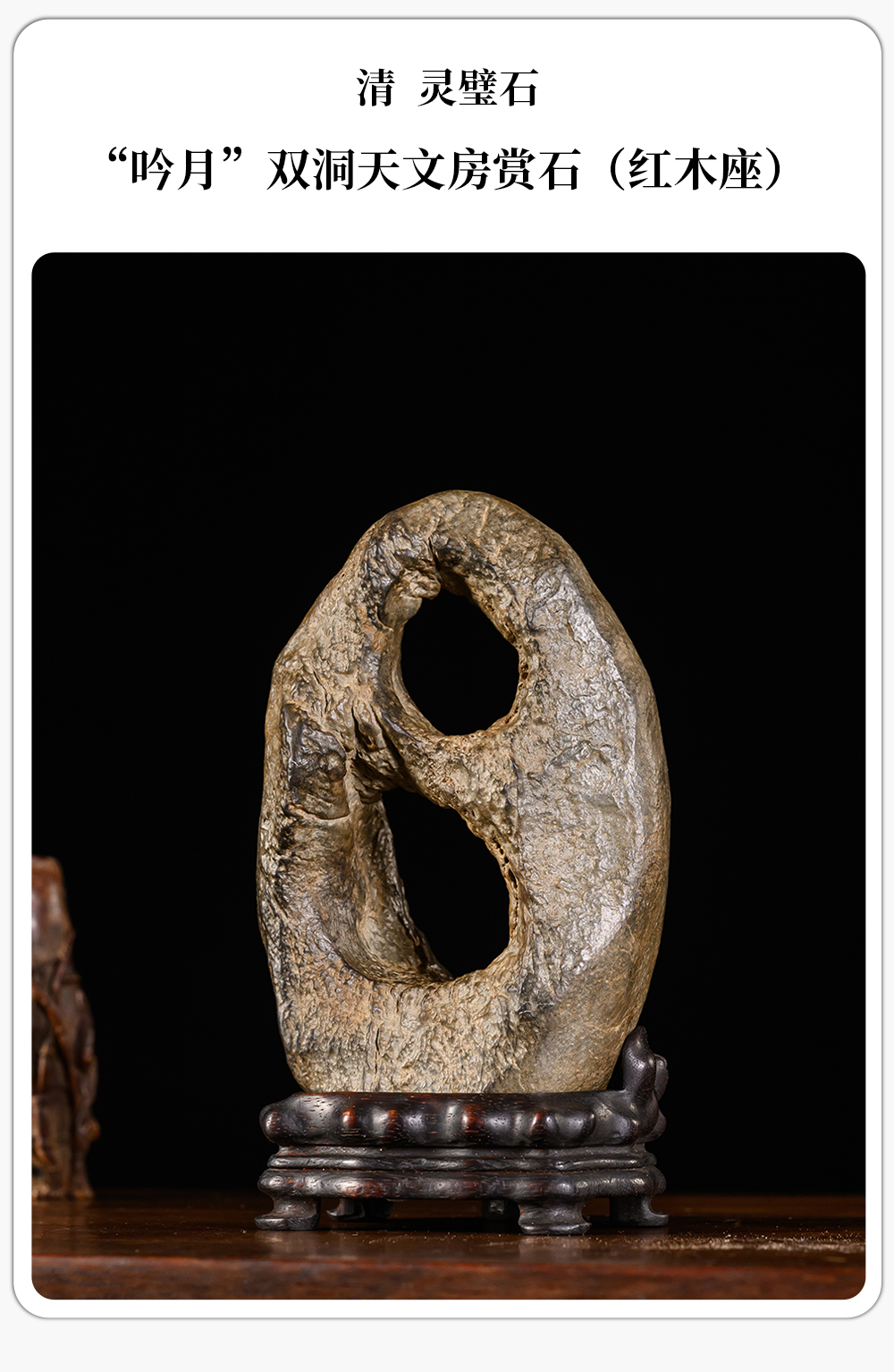 清 灵璧石“吟月”双洞天文房赏石(红木座)