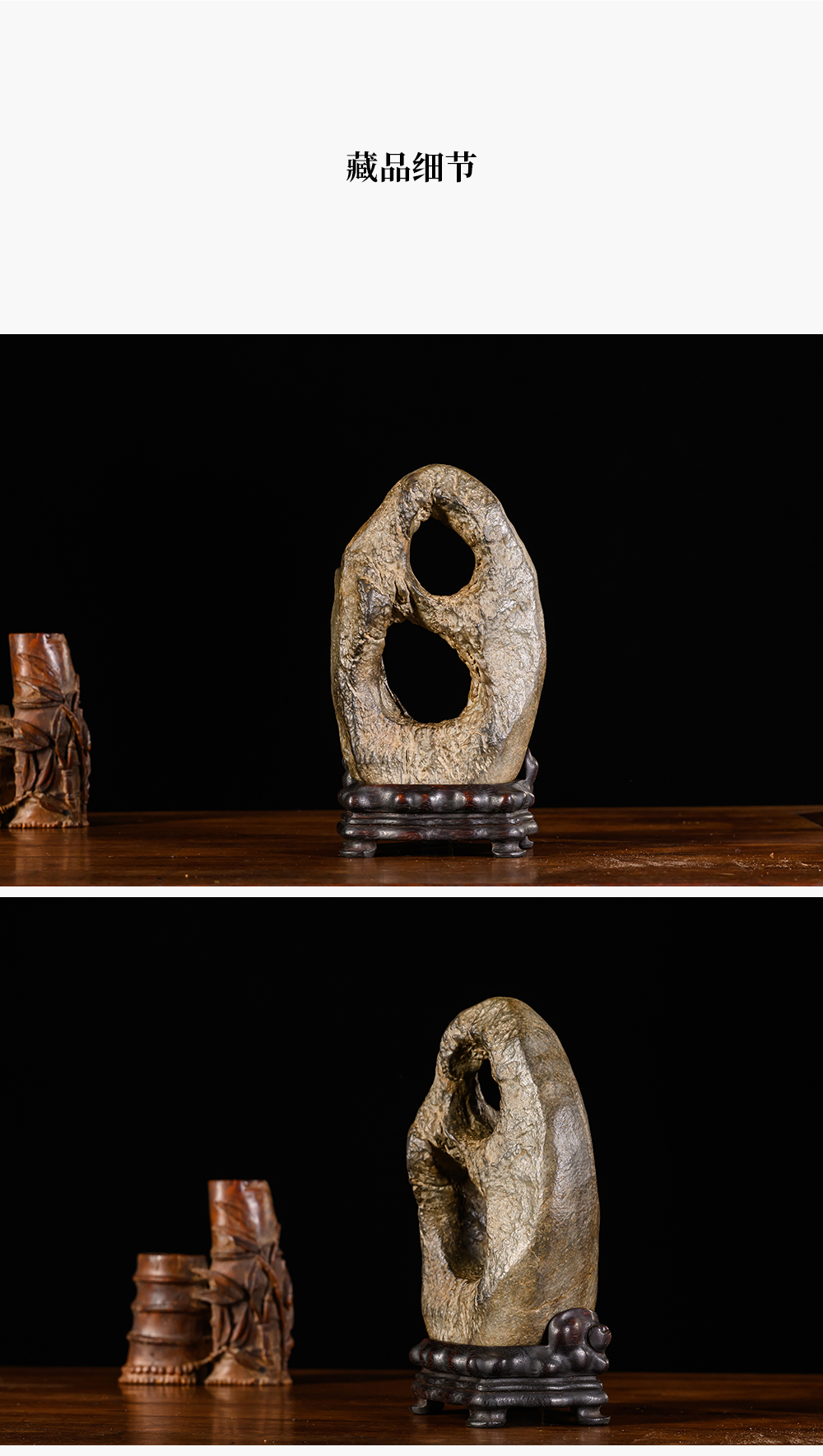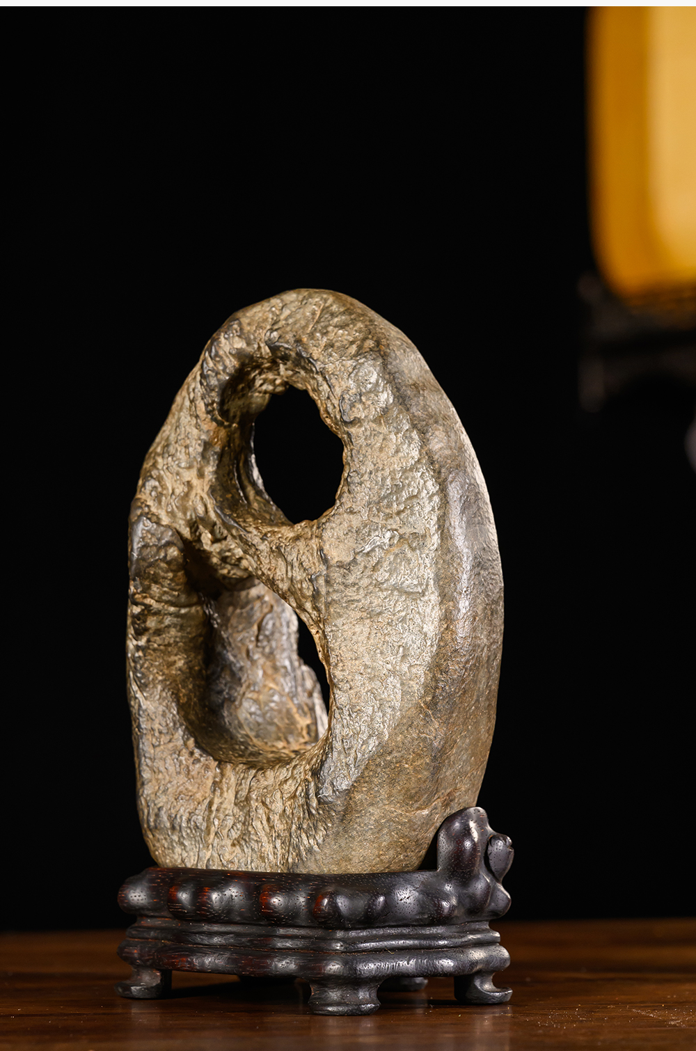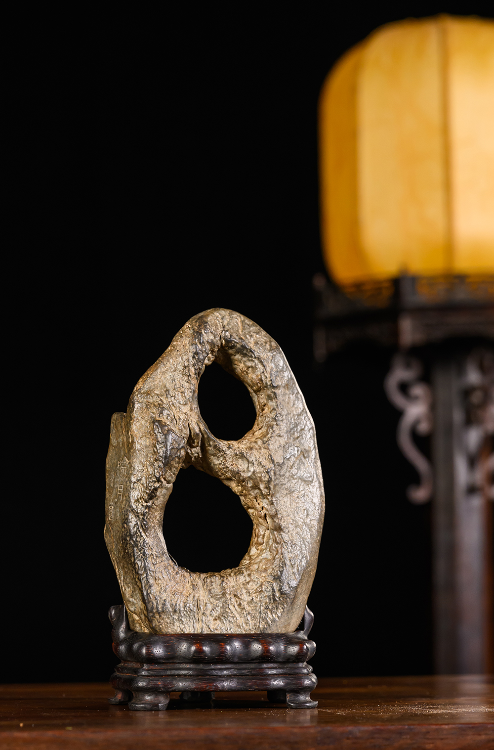 清 灵璧石“吟月”双洞天文房赏石(红木座)