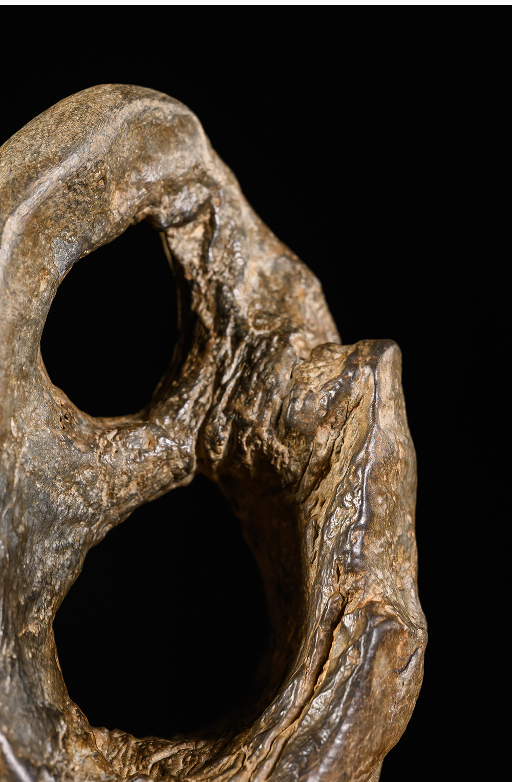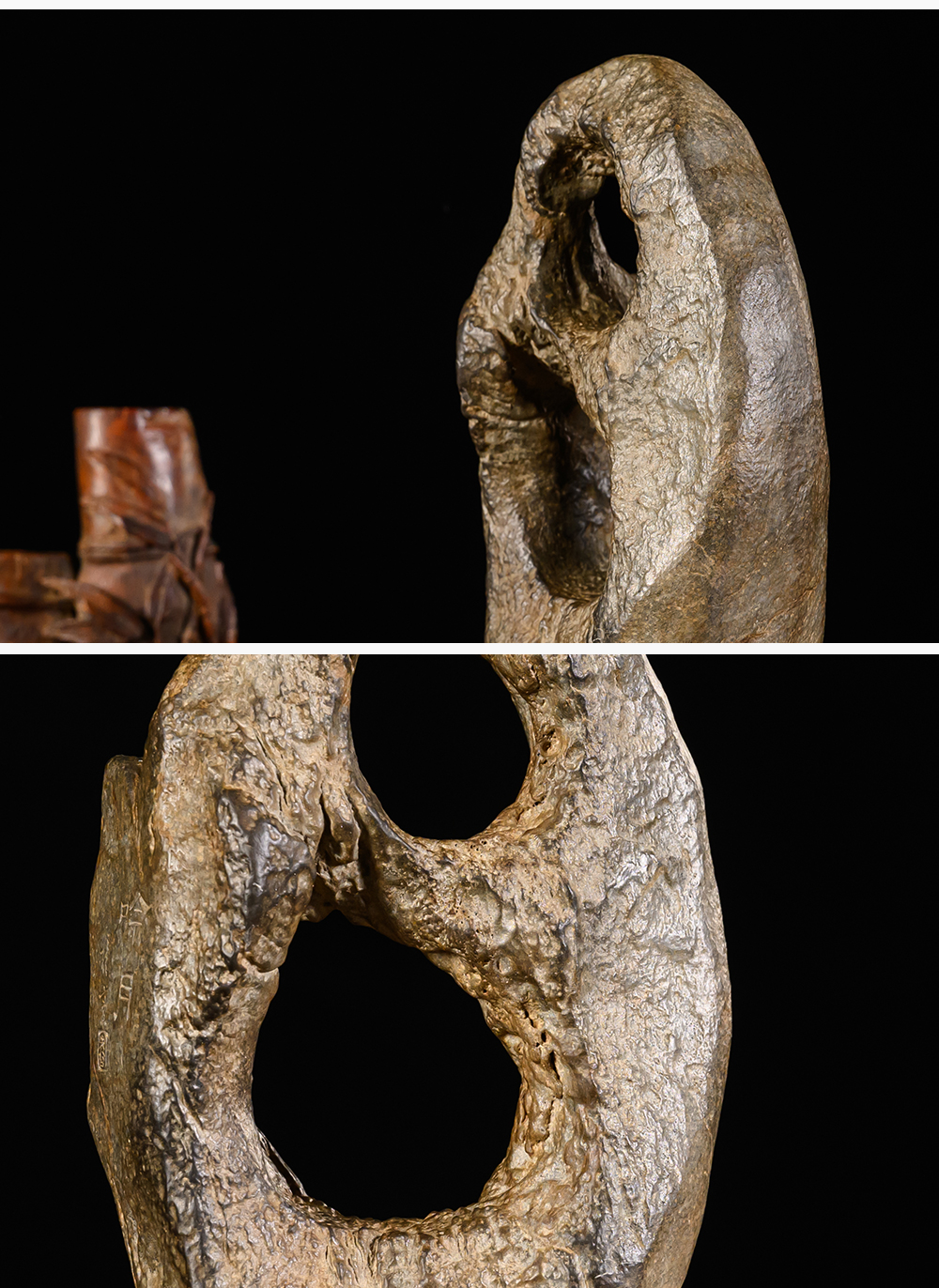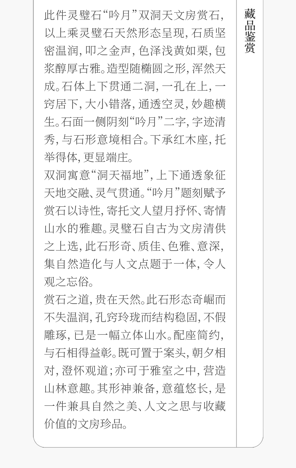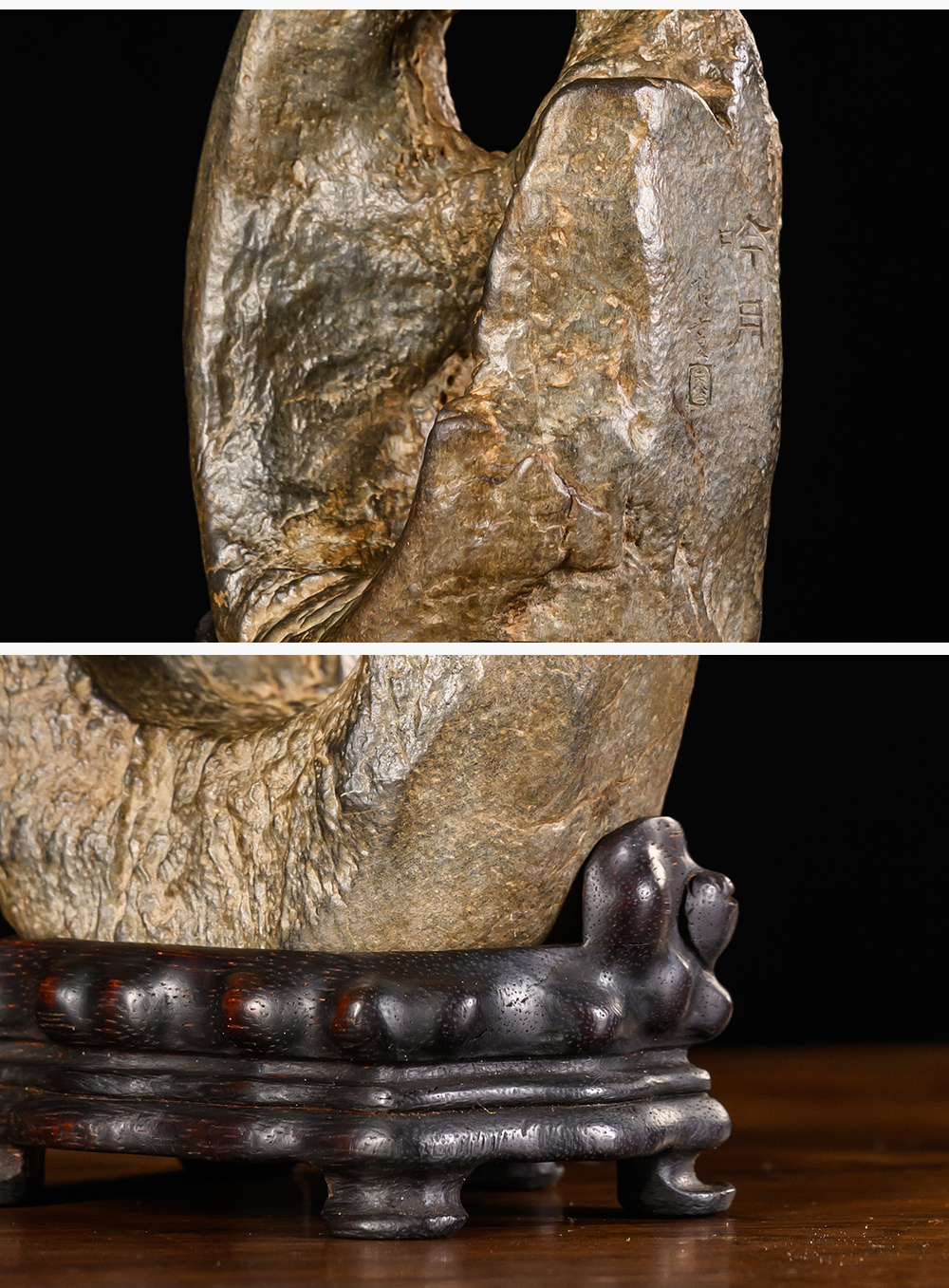 清 灵璧石“吟月”双洞天文房赏石(红木座)