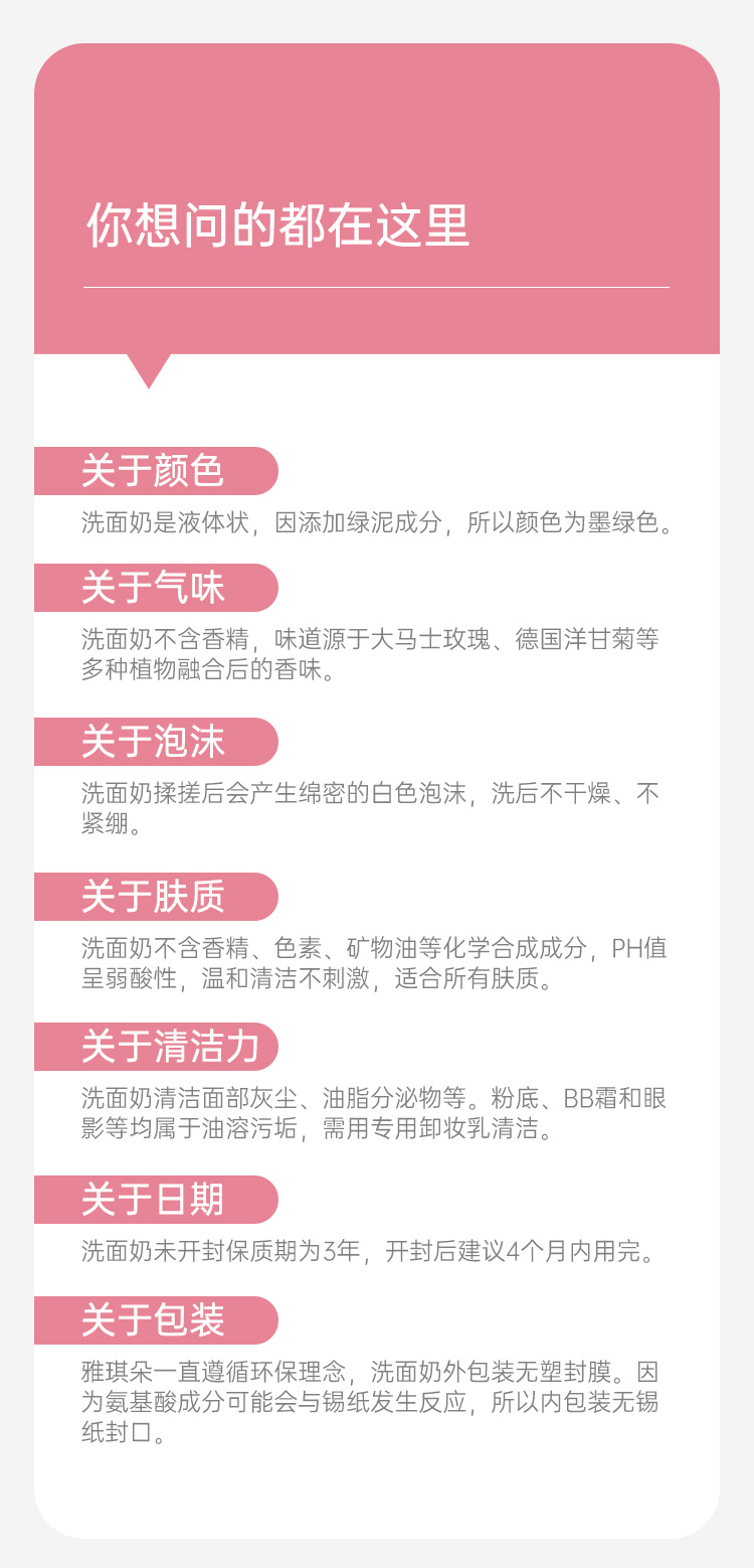 用天然来源的增稠剂黄原胶,将植物起泡剂、绿泥、植物提取物和精油成分融合,实现温和+清洁力并存,不伤皮肤自有保护膜,呈现绿色乳液质感。
