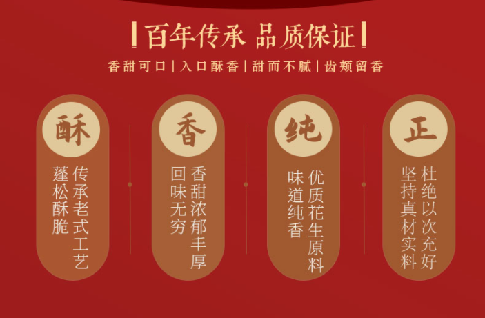 坚守花生含量60%,口酥松脆,香甜利口,含口自化;