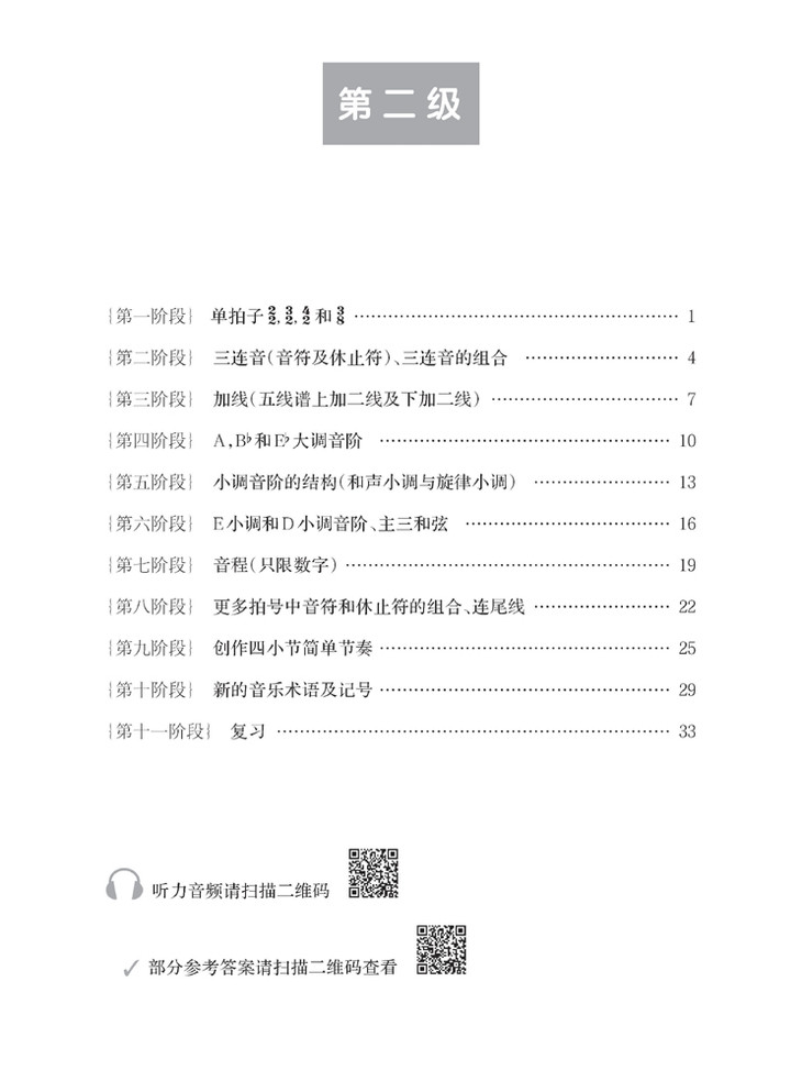 本书是第二级,共十个阶段的学习内容,包括:单拍子二二、二三、二四拍等,三连音的音符及休止符及组合,五线谱上下附加二线的学习,A大调、降B大调、降E大调音阶,旋律小调、和声小调结构学习,e小调、d小调音阶,音程,更多拍子记号中音符和休止符的组合,简单的四小节节奏创作,新的术语及符号等,最后一个阶段是对前面内容的综合复习。内容由浅入深、循序渐进,旨在通过科学而有效地练习,快速有效地提高学习者的音乐基础知识能力。通过对教材的逐步学习,可极其有效地提高学习者的音乐理论知识。同时,教材无缝对应英皇乐理考级第二级的学习内容。本套教材是英国皇家音乐学院联合考试委员会音乐考试(英皇考级)权威辅导用书,适用于乐理学习各个年龄和阶段的业余学习者和考试者,同时还适用于全国各类音乐院校的乐理课程教学。