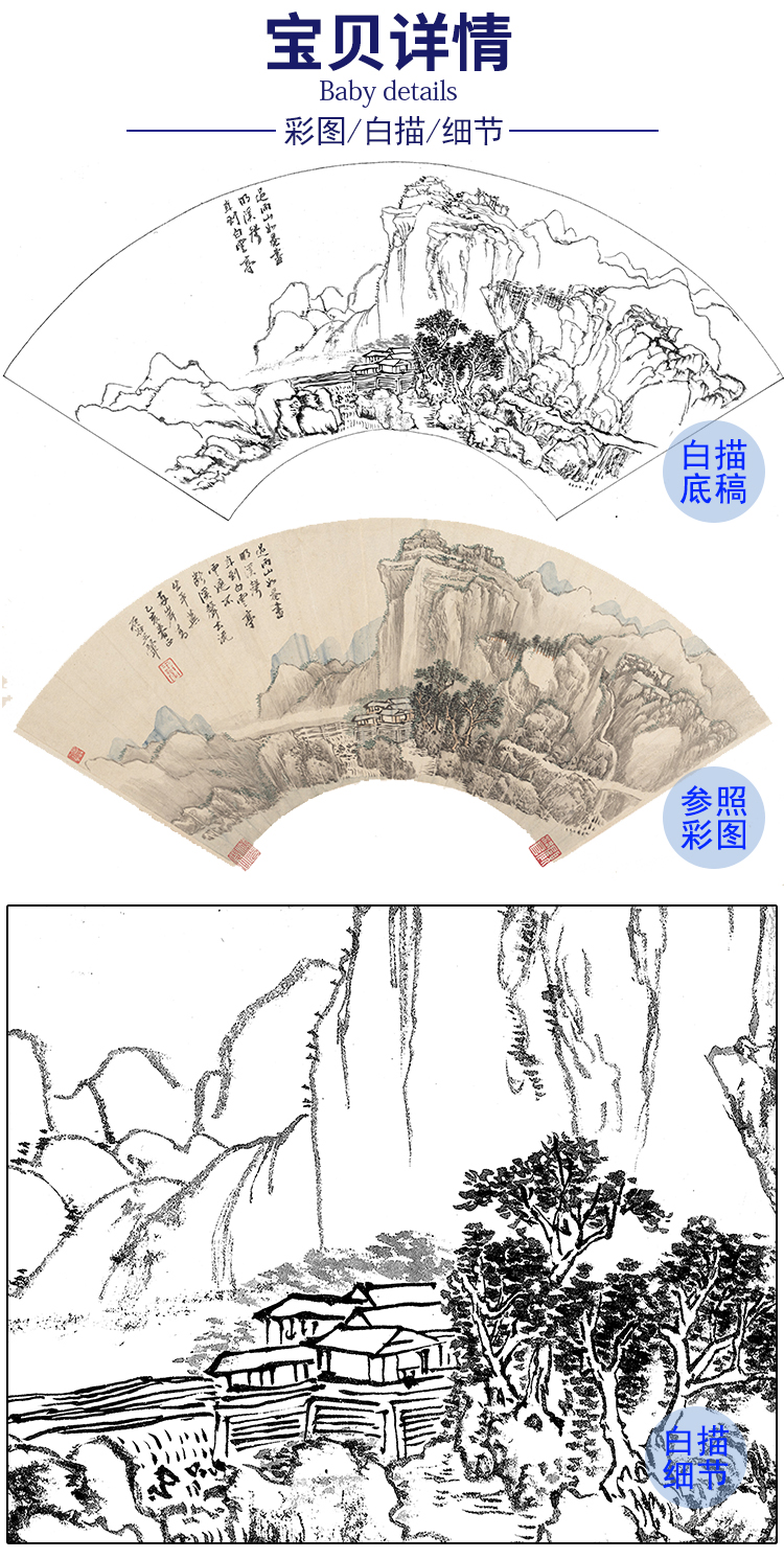 工笔画白描底稿 扇面小品 清 王翚 山水图-《雨过山图》-多种白描尺寸可选-SR39