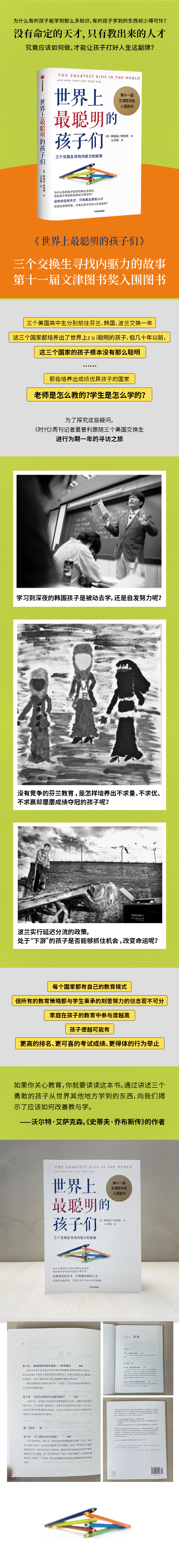 美国纪实报道记者阿曼达•里普利在这本书中讲述了三个美国高中生分别前往芬兰、韩国、波兰交换一年的故事,他跟随三个孩子,走访学校,与老师聊天,与当地学生交谈,探究不同文化背景下的学习方法和教育理念,深入地分析了教育强国背后的“秘密”。