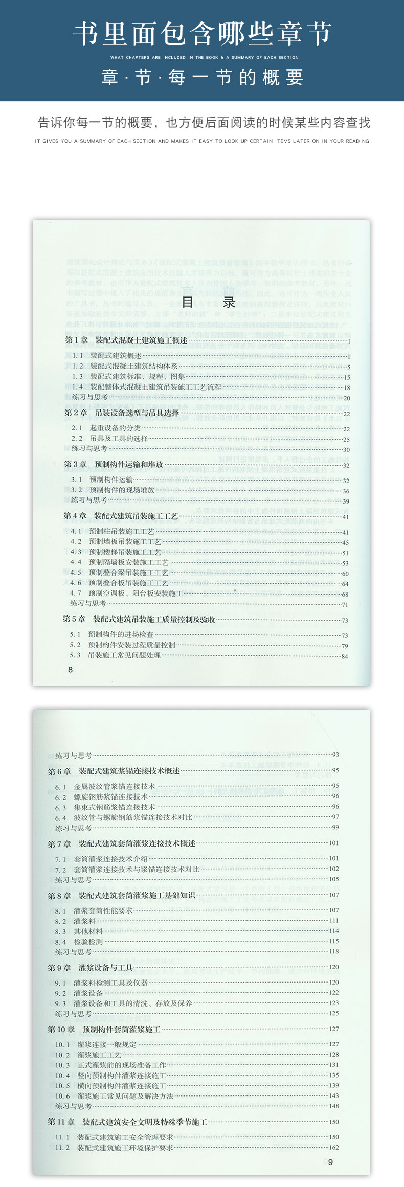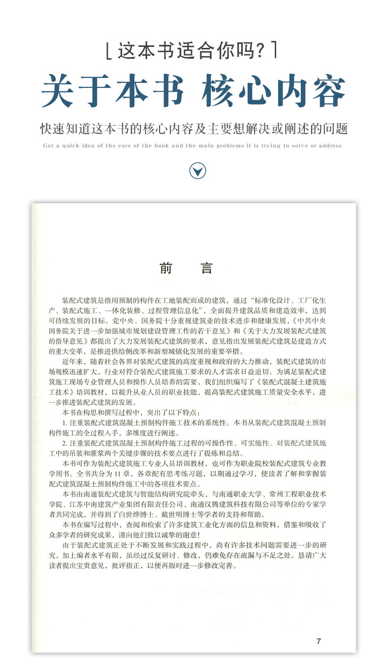本书由具有丰富装配式混凝土建筑施工技术的人员编写而成。全书由理论知识与实际操作训练两大部分内容组成。共包括:装配式建筑概述、吊装设备选型与吊具选择、预制构件运输和堆放、装配式建筑吊装施工工艺、装配式建筑吊装施工质量控制及验收、装配式竖向钢筋浆锚连接技术概述、装配式竖向钢筋套筒灌浆连接技术概述、装配式建筑套筒灌浆施工基础知识、灌浆设备与工具、竖向构件套筒灌浆施工、安全文明及特殊季节施工、装配式PC施工培训考核大纲等内容。 本书可以作为装配式建筑在职一线员工培训教育用书,同时也可作为建筑相关职业学院装配式建筑专业方向学生教学辅助用书。