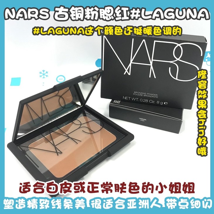 NARS 古铜粉腮红#LAGUNA👍新手必备❗❗❗#LAGUNA这个颜色还挺暖色调的,适合白皮或正常肤色的小姐姐。自然柔和🌬,塑造精致线条美。很适合亚洲人,带点细闪✨。修容效果会hin好哦👅,粉质也很细腻😇,刷在脸上很自然不容易手重。💁很适合黄皮妹子,显得妆容很干净、又自然😊,圆脸尖脸方脸随你选择,用明暗对比勾勒出你想要的轮廓👌。