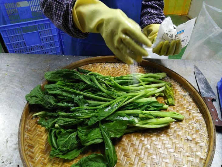 加盐,搓出多余的水分同时,也可以除芥菜本身的苦涩味道,使成品质地更加脆韧。