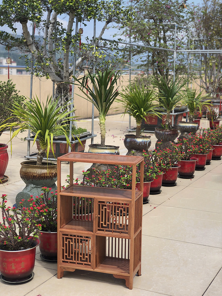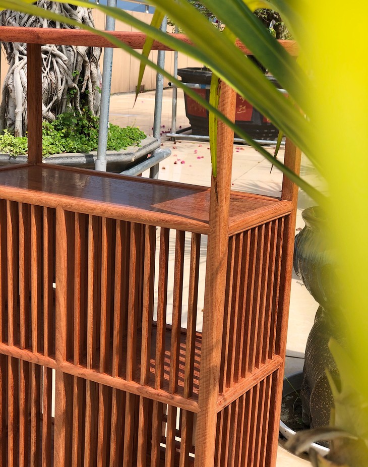 小博古架又可做茶水架用,用于陈设茶具、古玩器物等小摆件,直棂造型,通透性的架格带了“门”,呈现出高低错落的视觉效果,很是空灵通透。