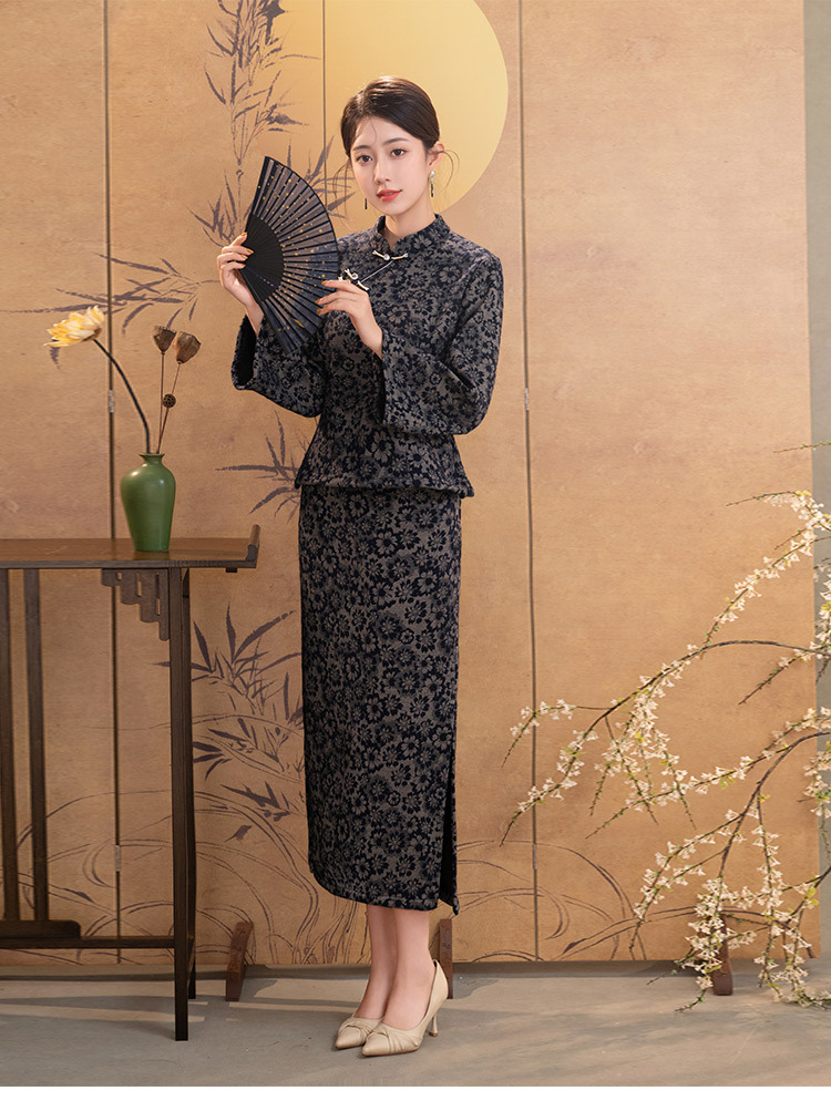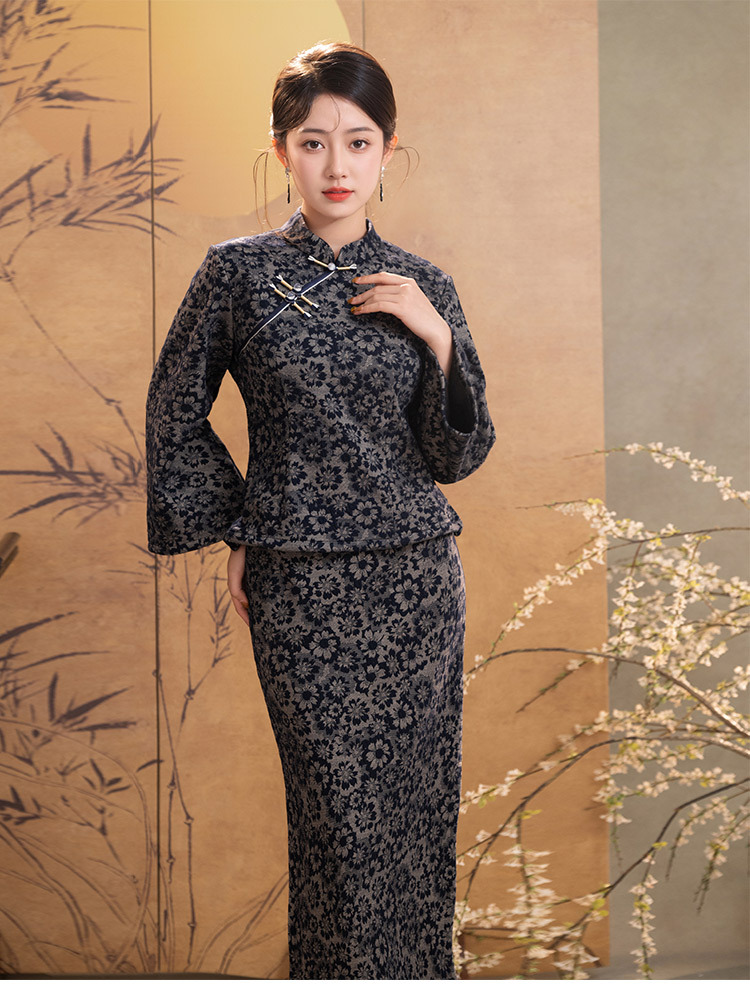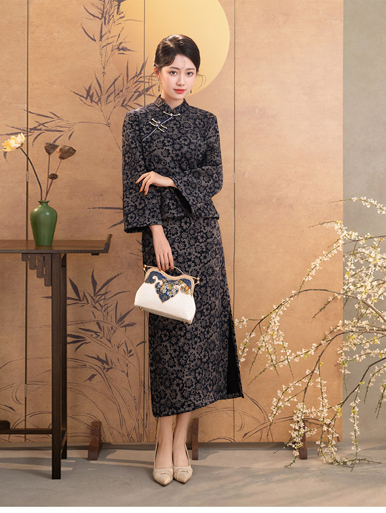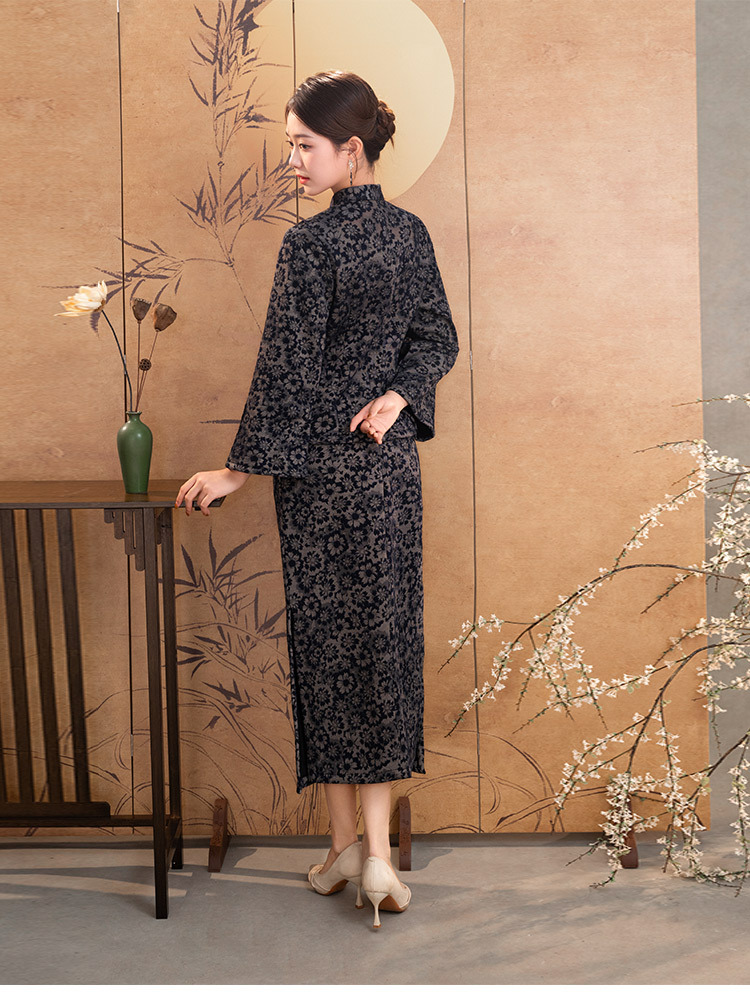 SC22628灰色长袖旗袍上衣改良新中式短款妈妈装女两件套装中国风秋冬季