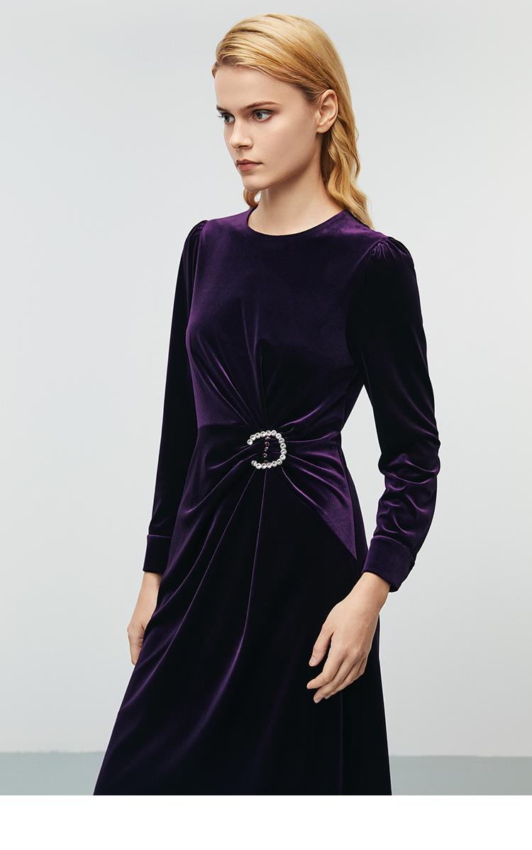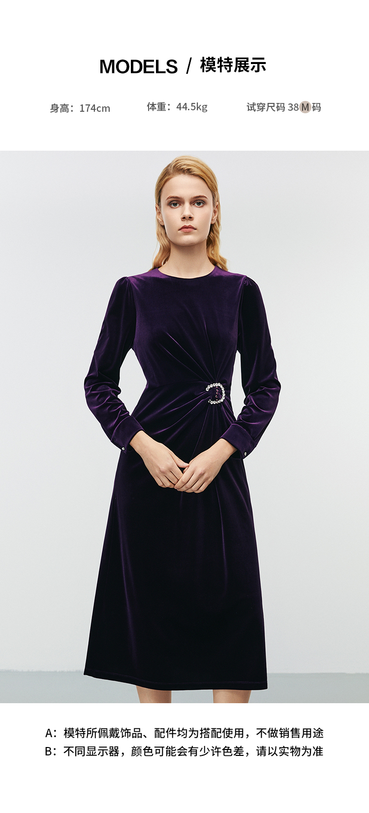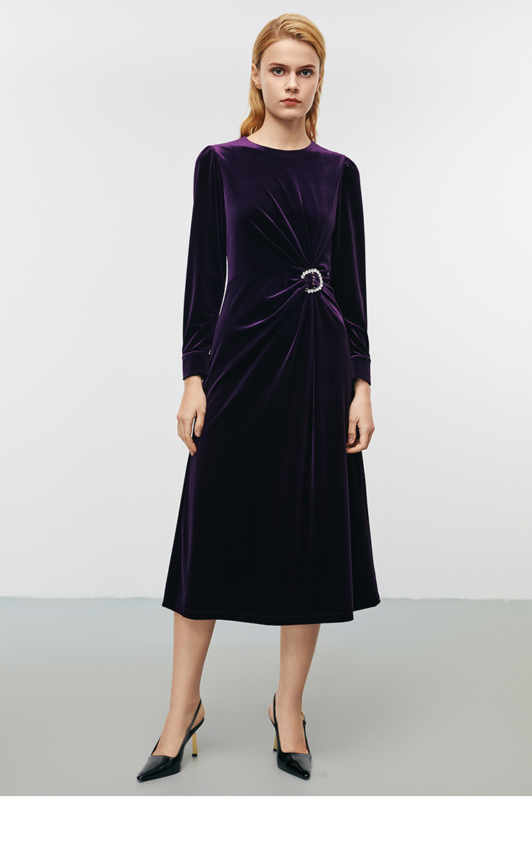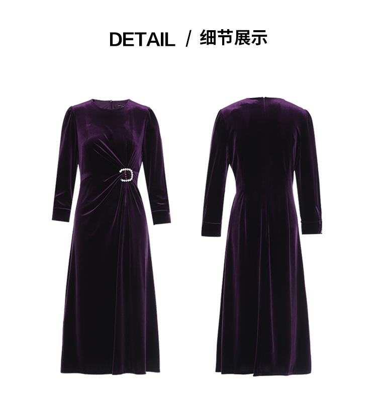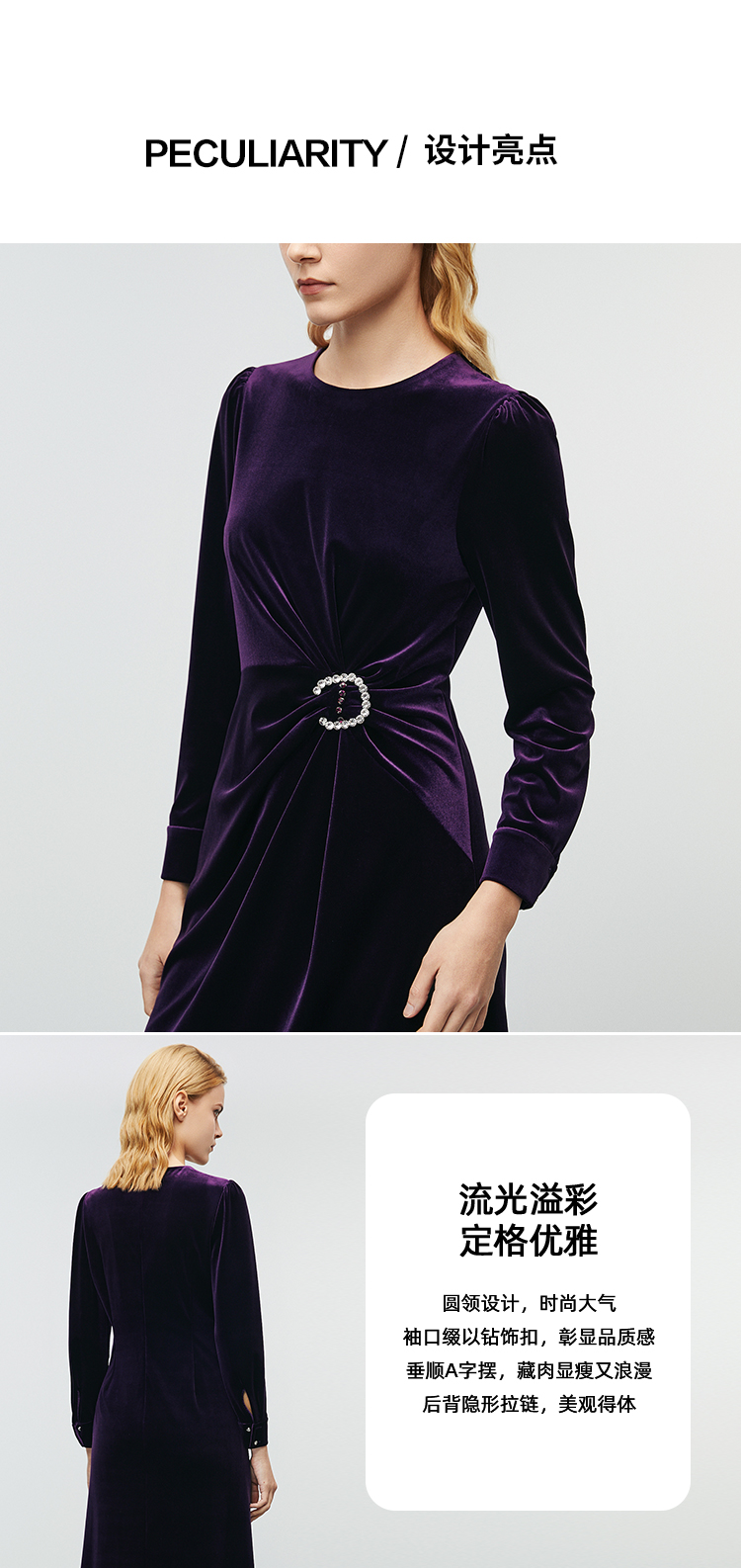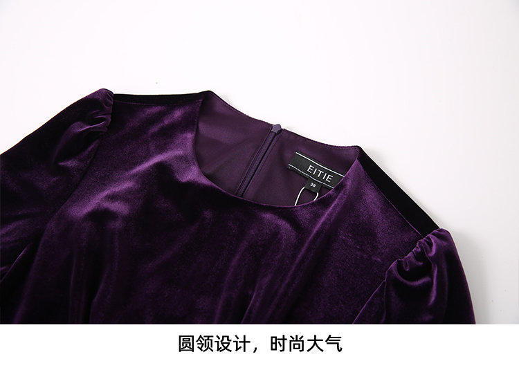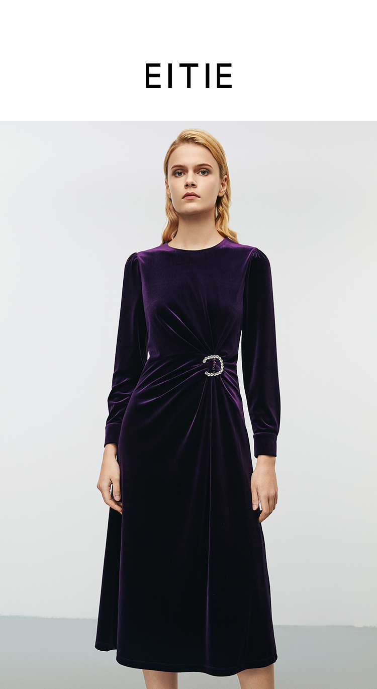 EITIE爱特爱秋季新款气质高级感法式紫色丝绒钉珠收腰礼服连衣裙7977615