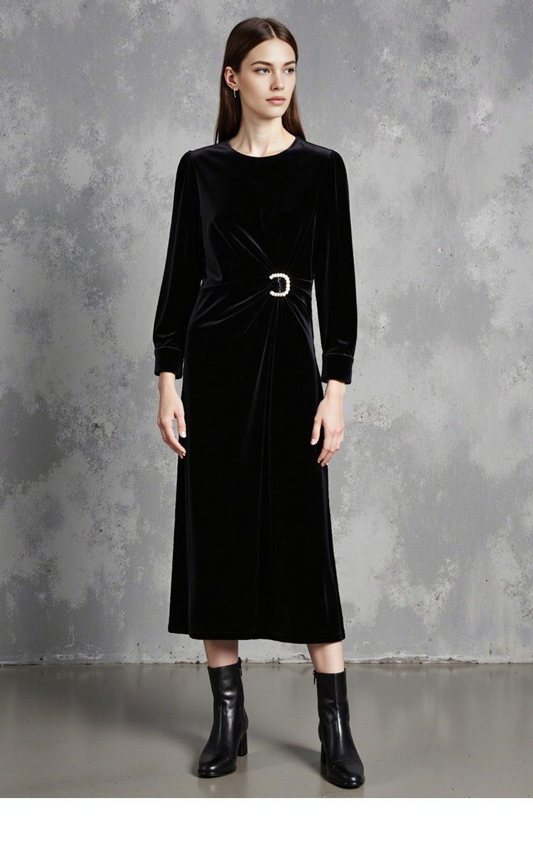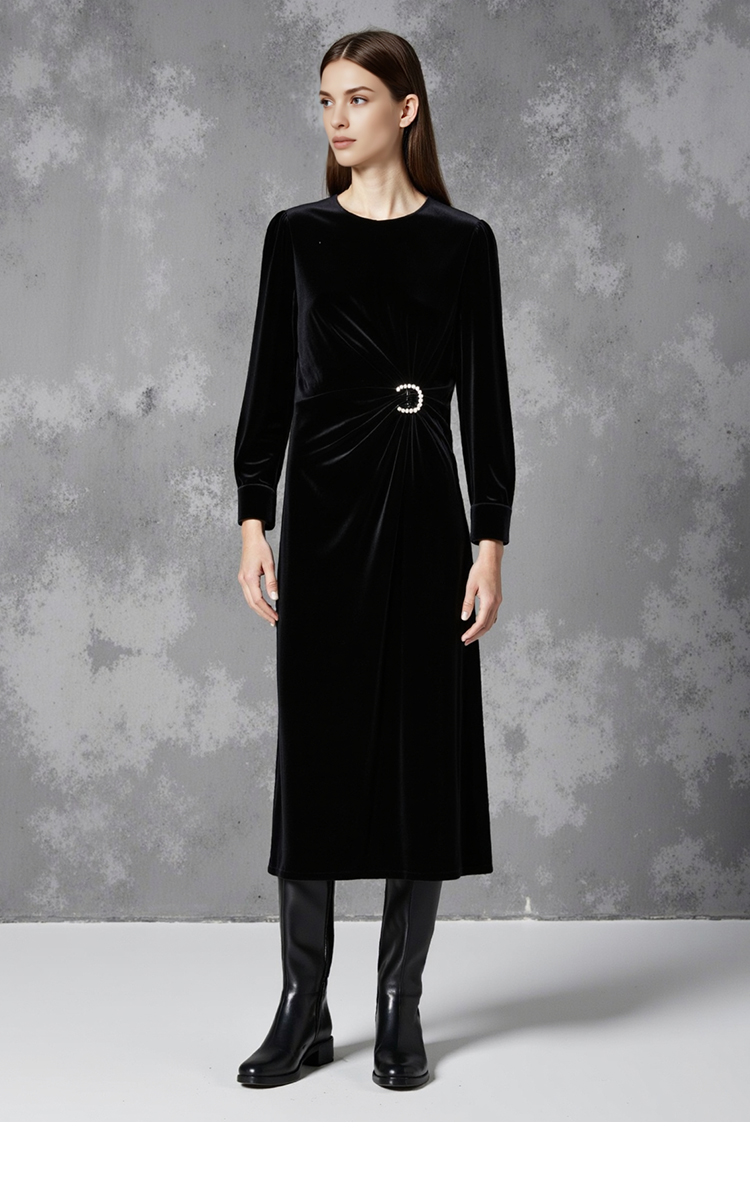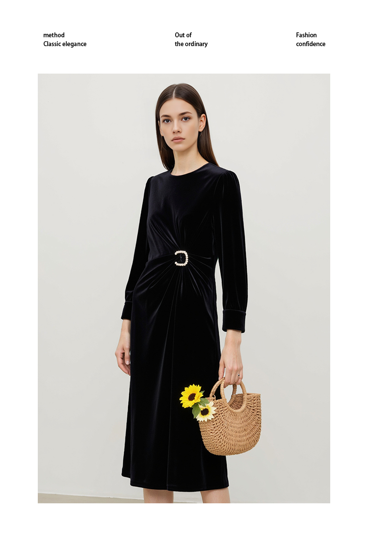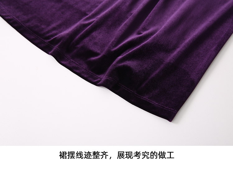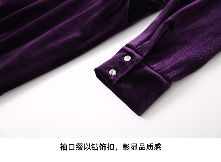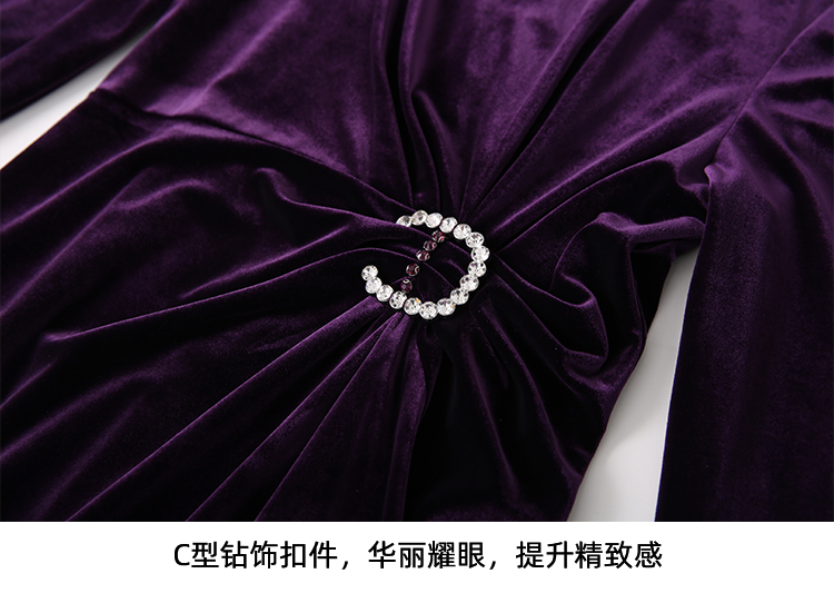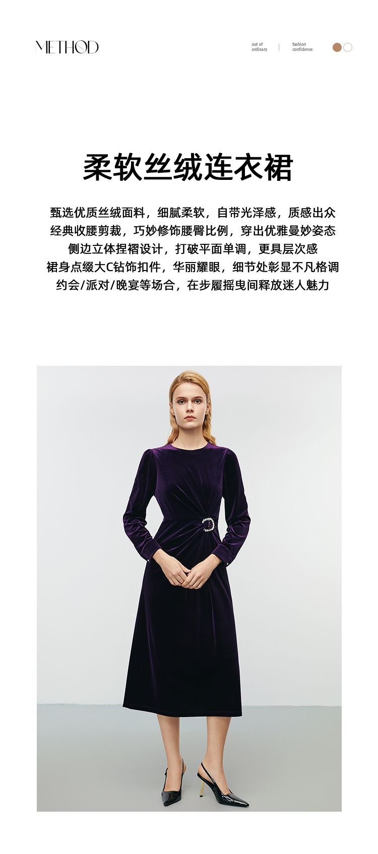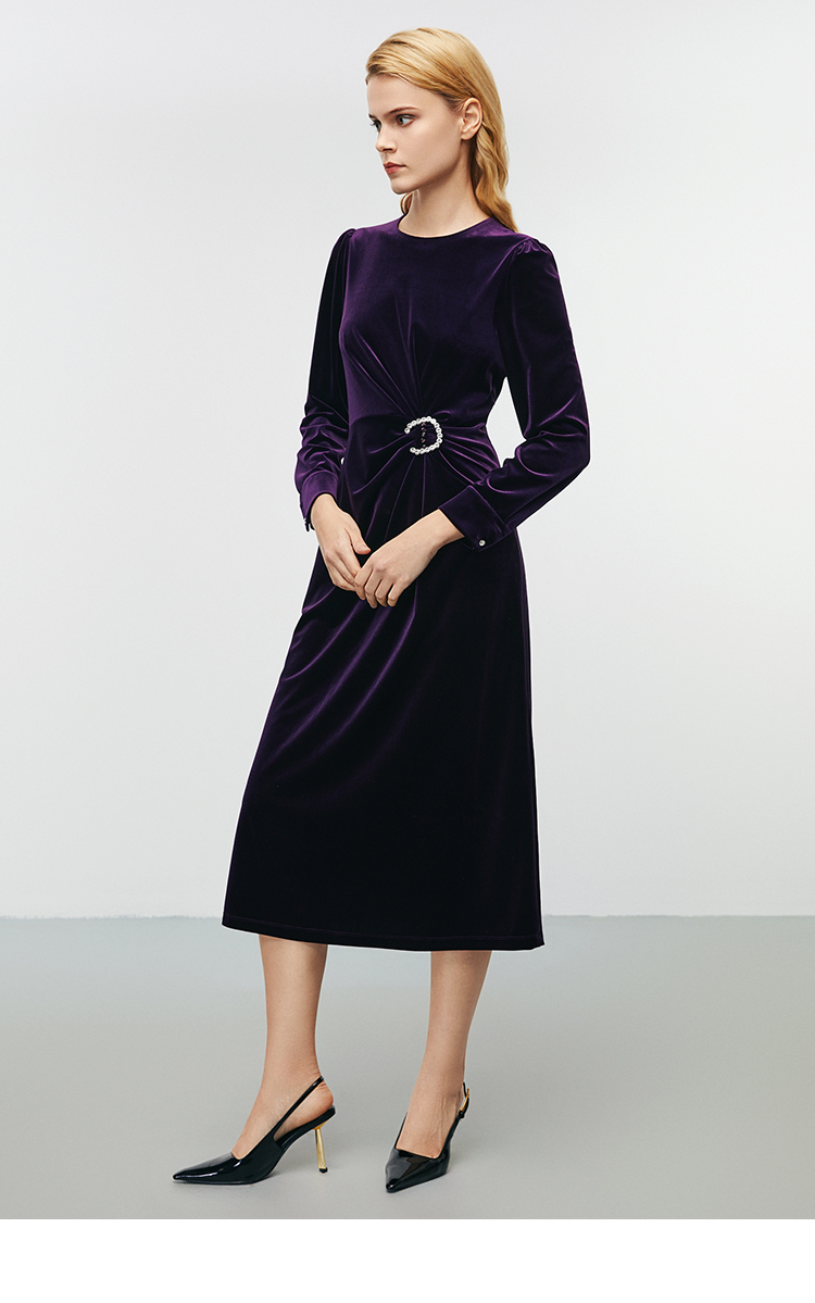 EITIE爱特爱秋季新款气质高级感法式紫色丝绒钉珠收腰礼服连衣裙7977615