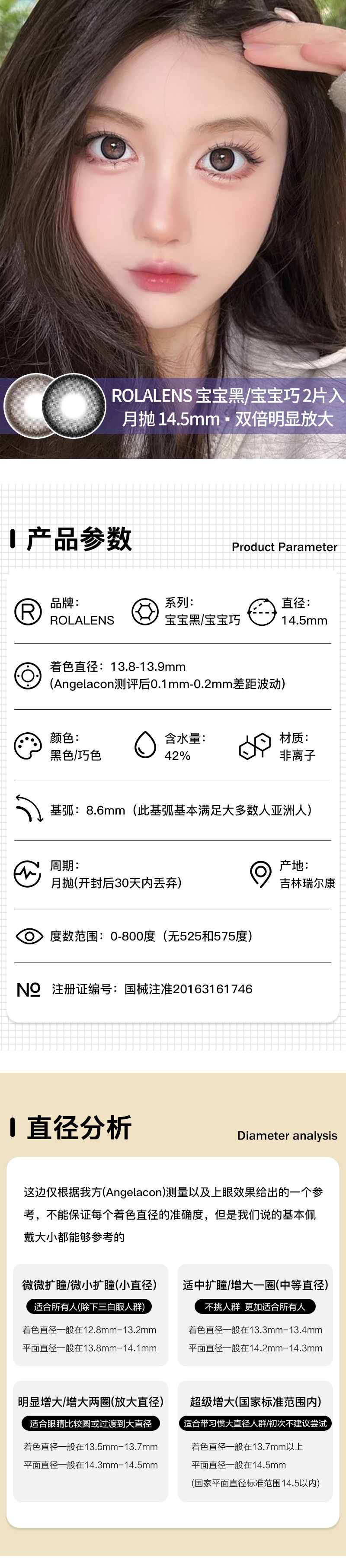 ROLALENS / 美瞳月抛 / 宝宝黑/宝宝巧 / 2片入 / 14.5mm / 双倍明显放大日常纯色款