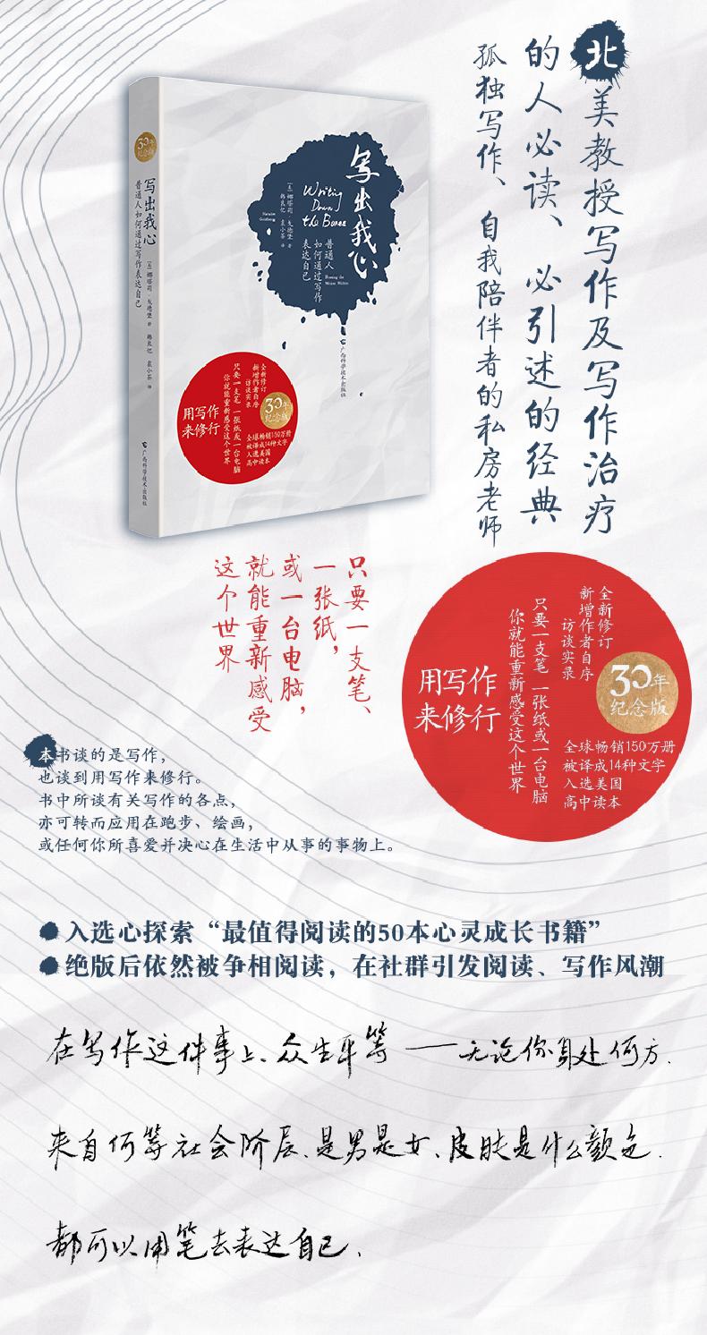 《写出我心》是我在1986 年出版的作品。我经常跟我的读者说,这本书的出版时间很幸运。如果换到50 年代出版,那一定就石沉大海了。恰好1986 年出版时,赶上了这个国家的大趋势——美国人开始有了表达自己的强烈需求。在写作这件事上,众生平等——无论你身处何方,来自何等社会阶层,是男是女,皮肤是什么颜色,都可以用笔去表达自己。在《写出我心》的读者来信中,有佛罗里达州保险公司的副总,也有内布拉斯加州的工厂工人;有密苏里河畔的采石工人,也有得克萨斯州监狱的囚徒。他们之中有律师、医生、同性恋人权斗士、家庭主妇、图书馆管理员、教师、牧师,甚至是某些政治家。在当时,一场全民写作的大革命就在美国开始流行。书店里开始有了“写作教程”专类的书架,有个学生甚至跟我说:“我明白了,写作,是一个新的宗教信仰。”