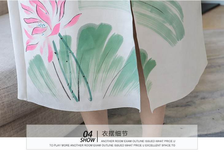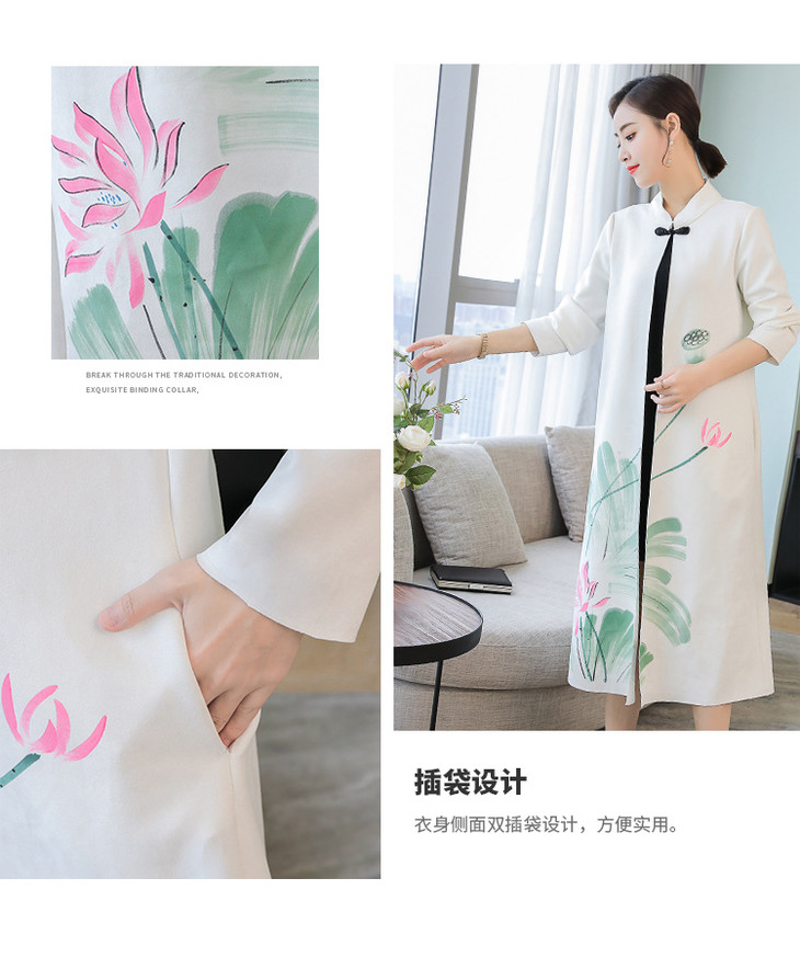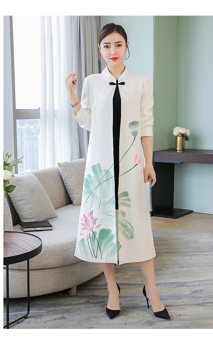 HT-XYX8151新款复古优雅气质修身立领盘扣长袖中长款手绘印花外套