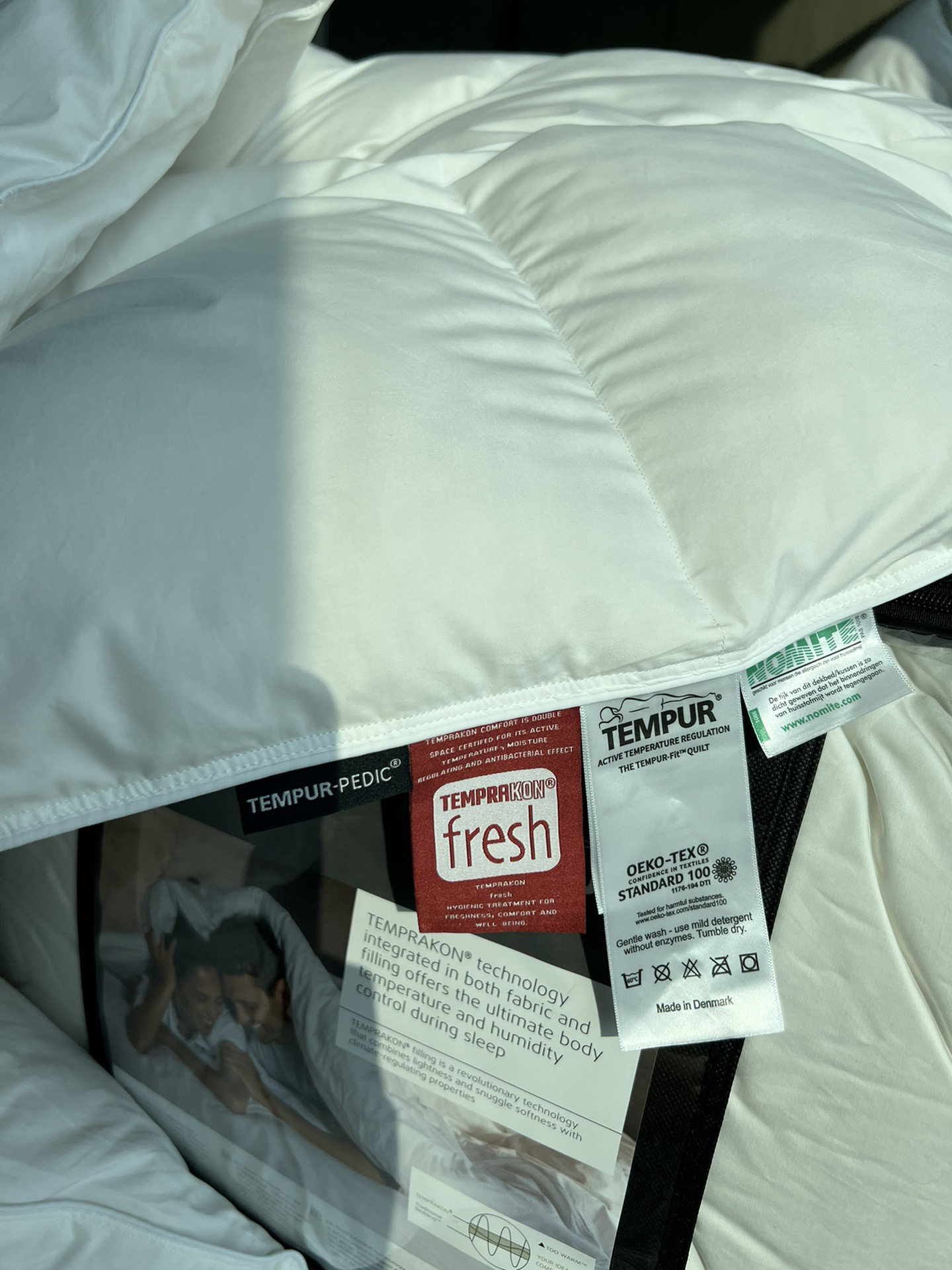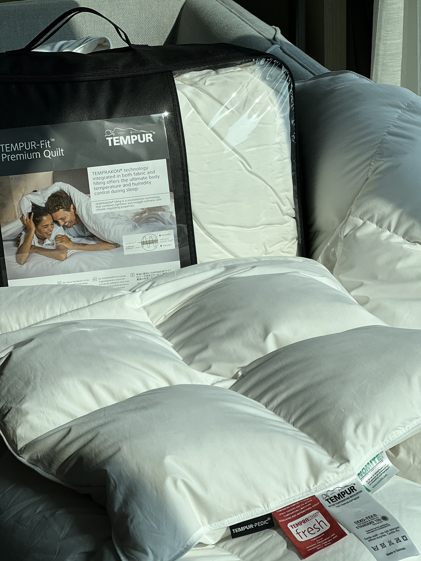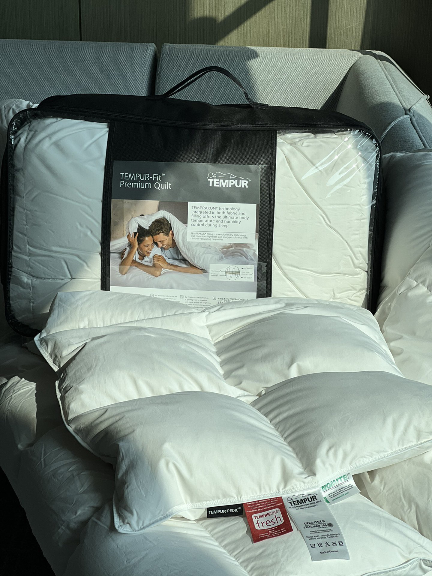 TEMPUR-FIT™PREMIUM QUILT顶级羽绒被 填充物基于TEMPRAKON技术 由西伯利亚进口95%白鹅绒制成 面料是是超级柔软三角棉制成 顶层由可调节温度的TEMPRAKON ADVANCE材料制成 称为活性新鲜的抗微生物处理 羽绒产品比较重要的是羽绒的品质与产地 之所以选择TEMPUR 是因为TEMPUR对原材料的把控都非常严格 该款产品不在国内销售 主要供应丹麦和欧洲市场 丹麦属于北欧寒冷地区 对羽绒被的要求非常高 而且生产完全是欧洲标准 完全值得信赖 可以在丹麦TEMPUR官网查到同款产品哦