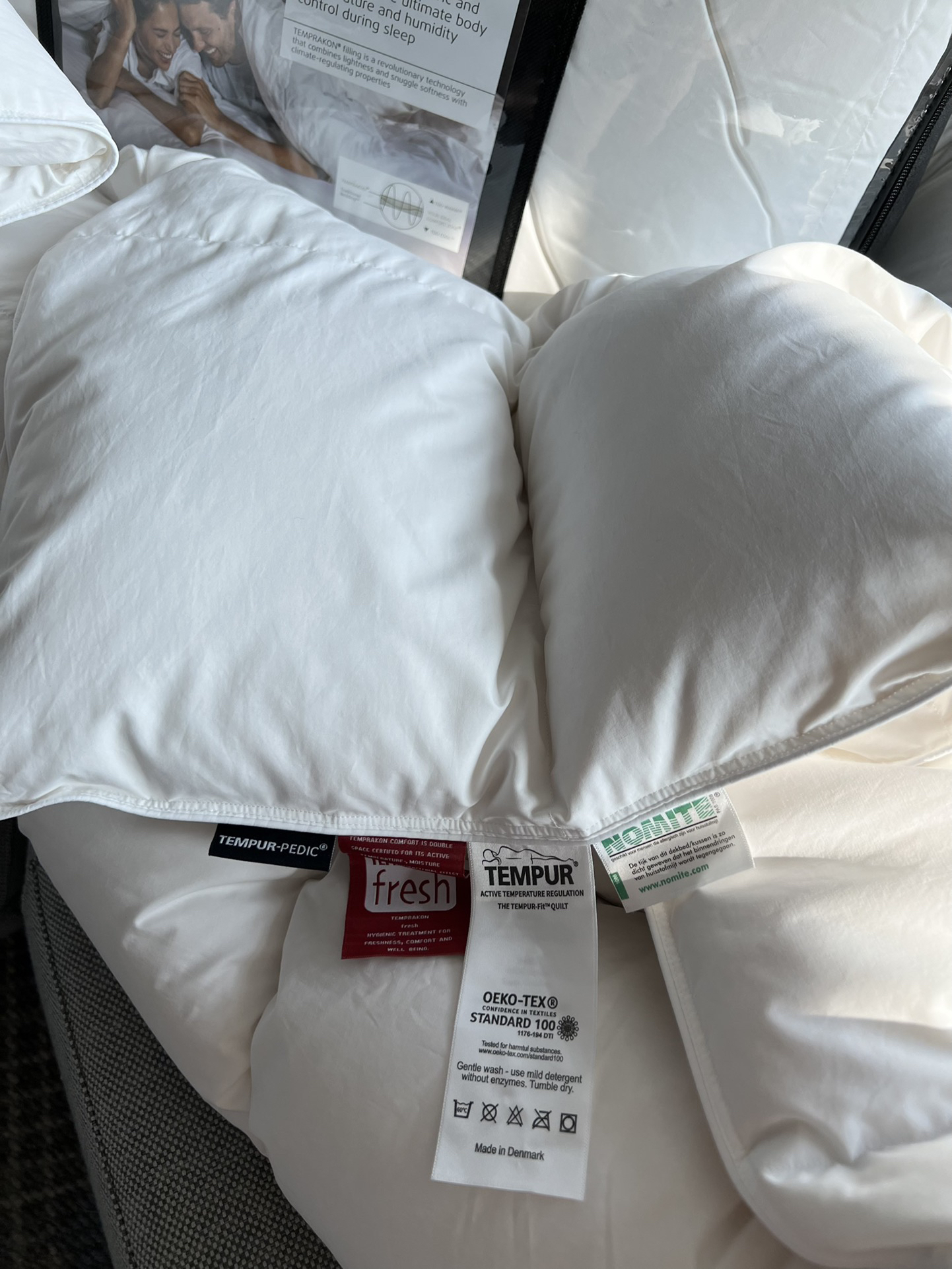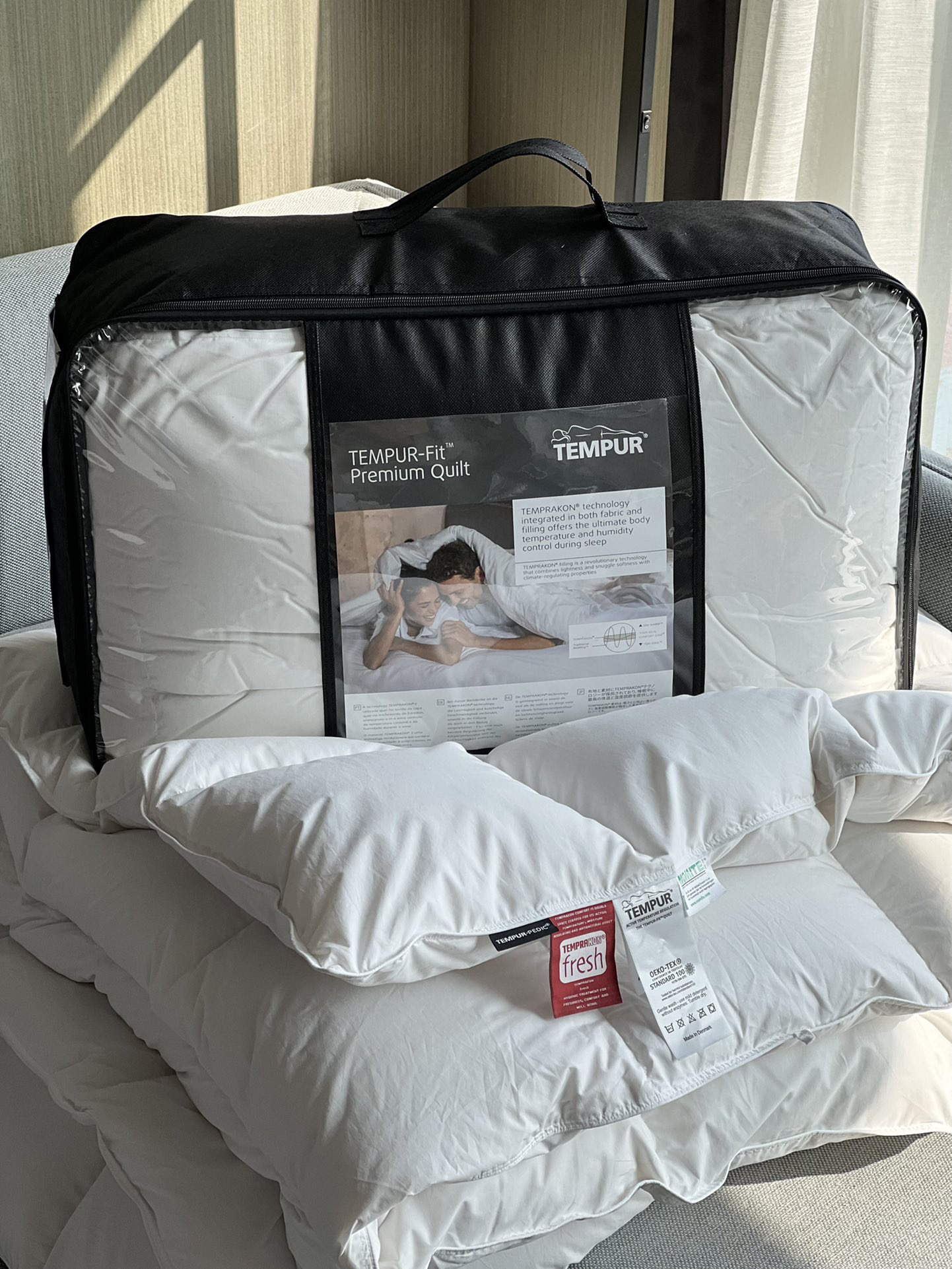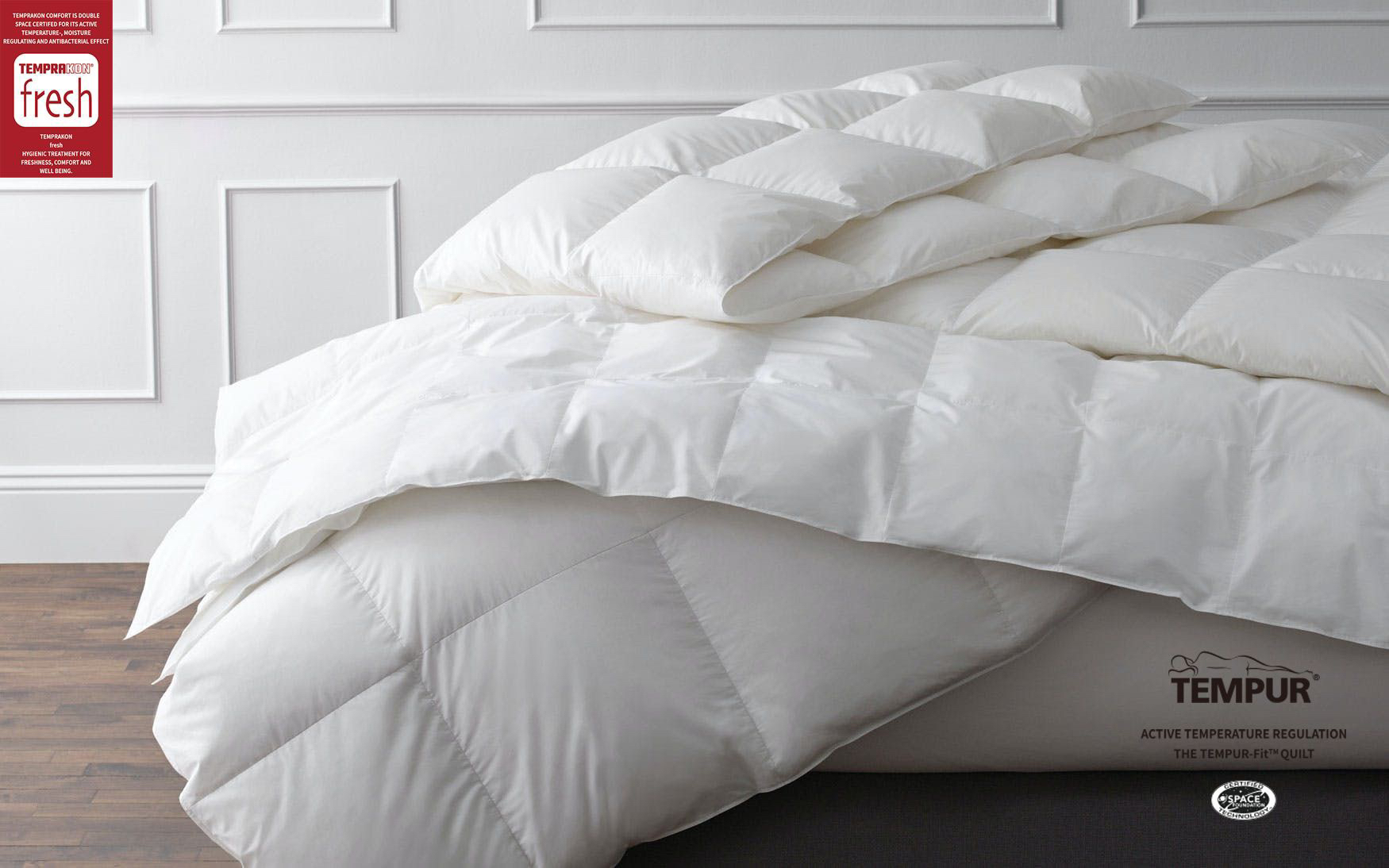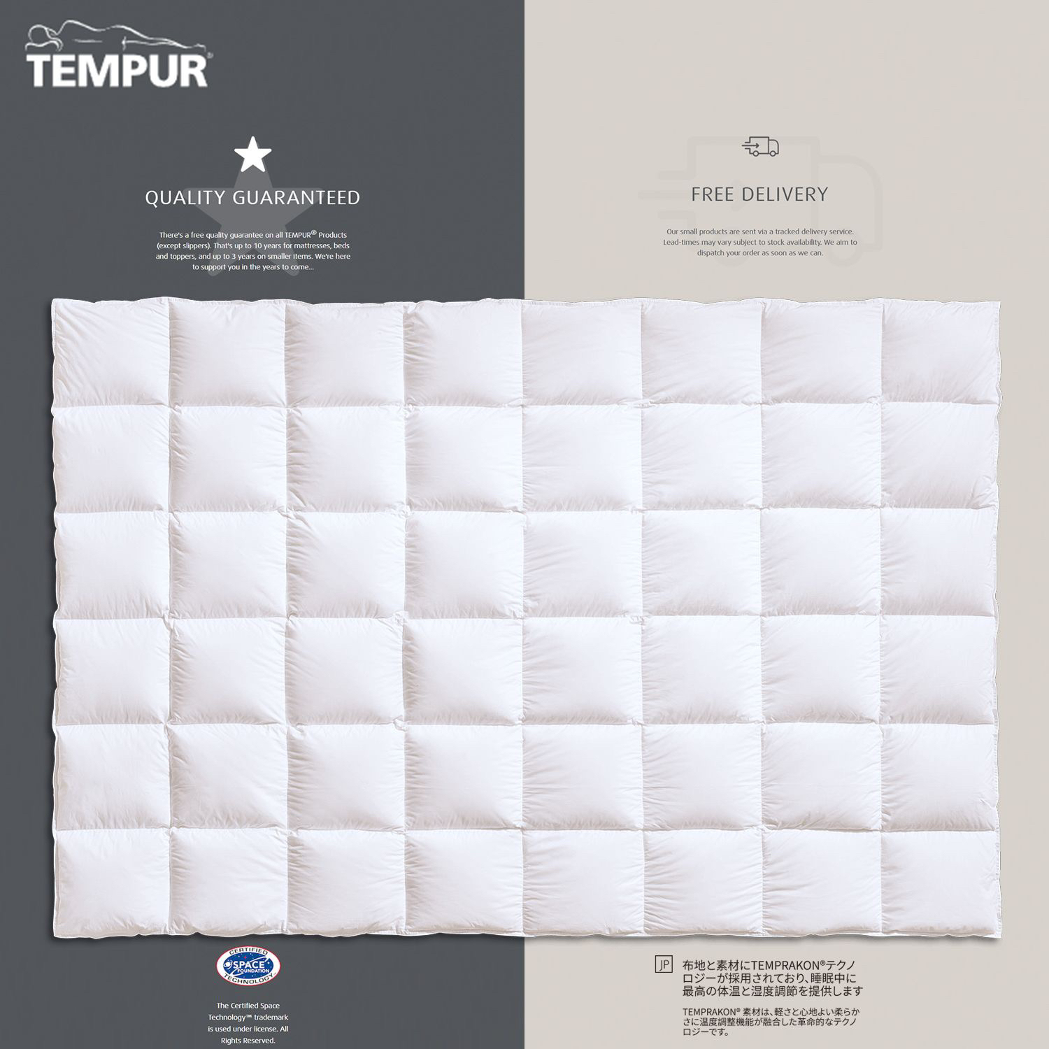 TEMPUR-FIT™PREMIUM QUILT顶级羽绒被 填充物基于TEMPRAKON技术 由西伯利亚进口95%白鹅绒制成 面料是是超级柔软三角棉制成 顶层由可调节温度的TEMPRAKON ADVANCE材料制成 称为活性新鲜的抗微生物处理 羽绒产品比较重要的是羽绒的品质与产地 之所以选择TEMPUR 是因为TEMPUR对原材料的把控都非常严格 该款产品不在国内销售 主要供应丹麦和欧洲市场 丹麦属于北欧寒冷地区 对羽绒被的要求非常高 而且生产完全是欧洲标准 完全值得信赖 可以在丹麦TEMPUR官网查到同款产品哦