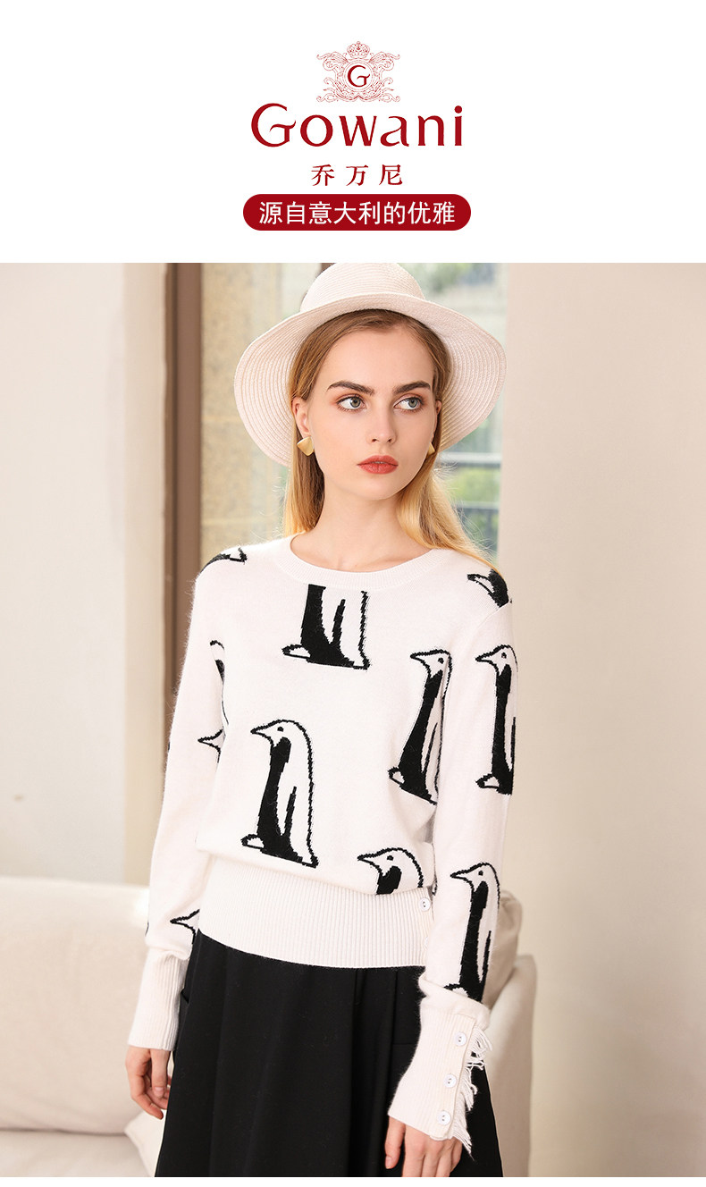 乔万尼秋季小企鹅图案羊毛针织衫时尚长袖圆领毛针织衫女EN3M409