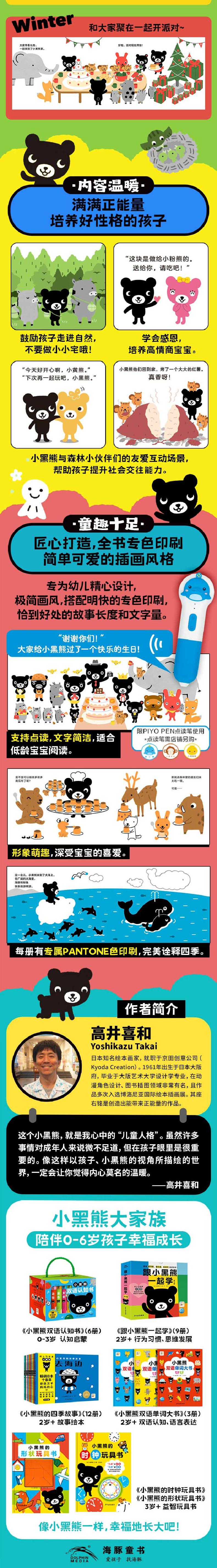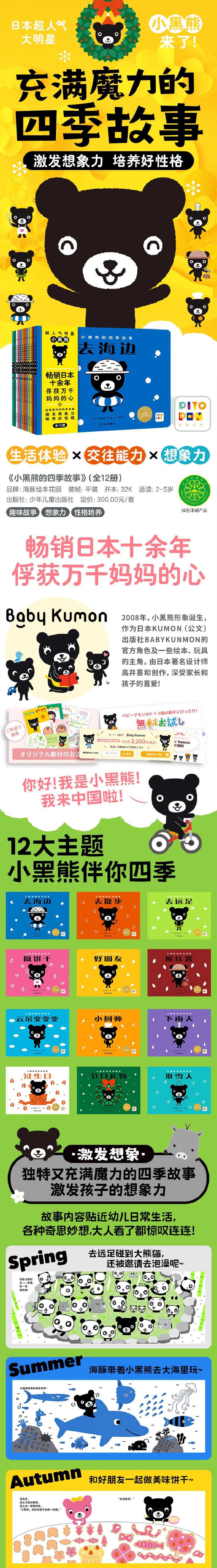 《小黑熊的四季故事》是一套充满想象力和趣味性的故事绘本,适合2~5岁的孩子阅读,一共有12册:《去海边》《拔红薯》《好朋友》《去远足》《下雨天》《去散步》《小厨师》《云朵变变变》《做饼干》《过生日》《节日礼物》《堆雪人》。故事契合幼儿心理,将颜色、形状等视觉感受和四季结合,从幼儿日常生活事件出发,呈现了主人公小黑熊探索世界,以及与森林小伙伴们丰富有趣、温馨有爱的互动场景。文字简洁,画风萌趣,线条清新,色彩鲜明,非常符合低龄儿童的审美、阅读习惯。