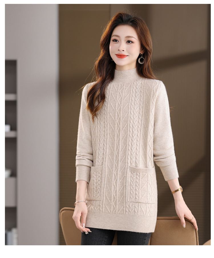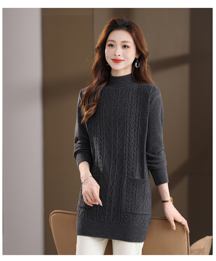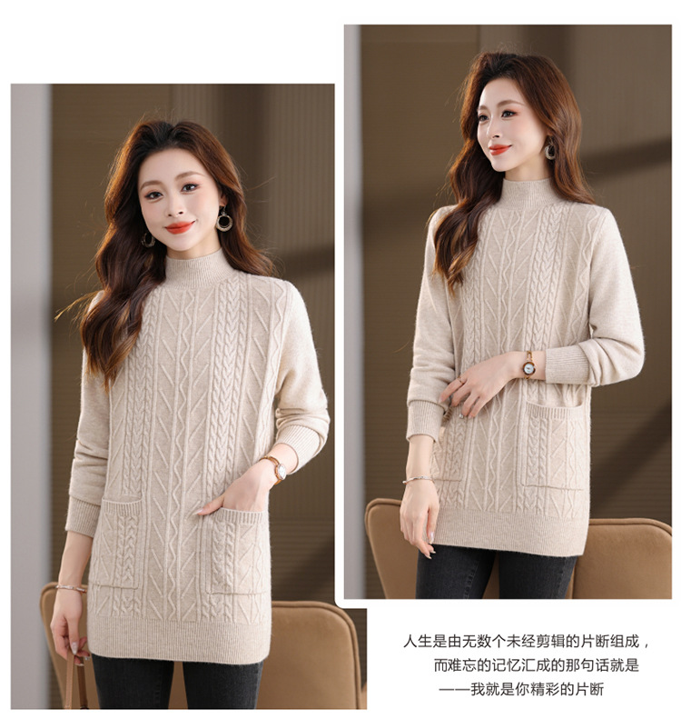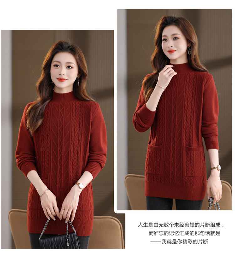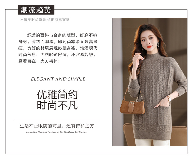 FCFQ67723 中长款长袖外穿毛衣女秋冬季新款宽松半高领口袋气质针织打底衫潮 商品图1