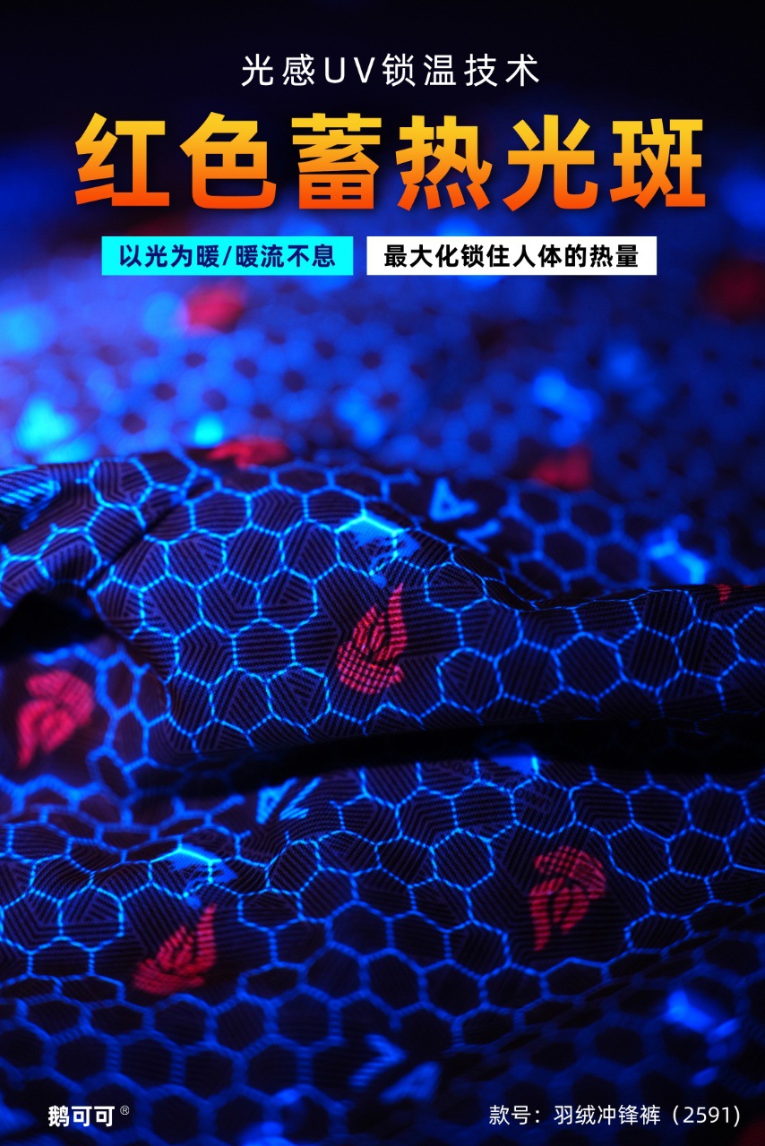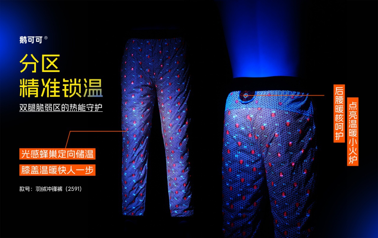 前片及后腰处巧妙植入嵌合火焰储热膜,内置亿万级光感粒子,火焰光斑主动捕捉环境光能,热力值UP,打造双腿37℃“黄金舒适圈”。别出心裁的UV温感技术,在紫外线的作用下,形成红色的蓄热火焰光斑,有效呵护双腿脆弱区。